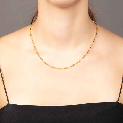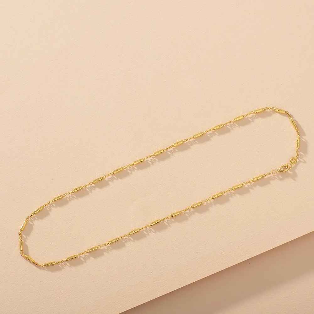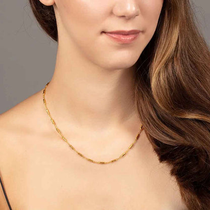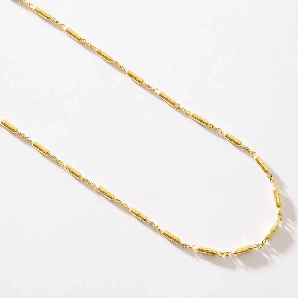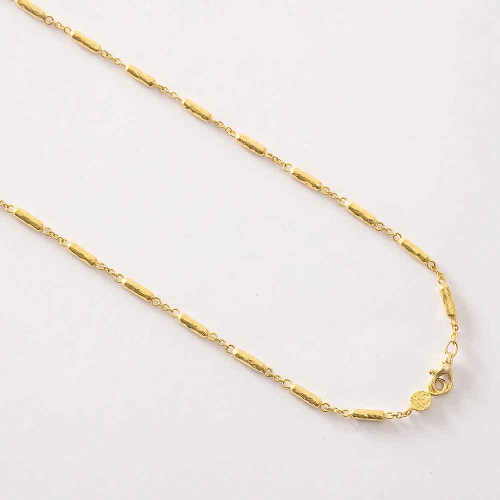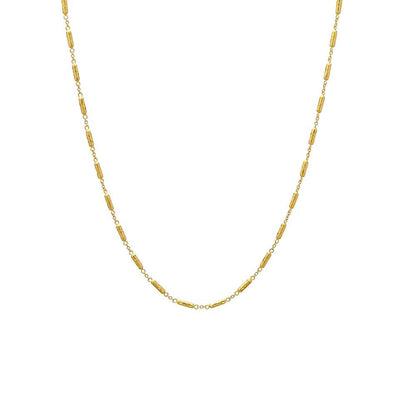 This Gurhan Vertigo necklace is crafted in 24K yellow gold. The single strand necklace is comprised of alternating chain links and 2.5mm gold beads. This chain necklace measures 18 inches long.
