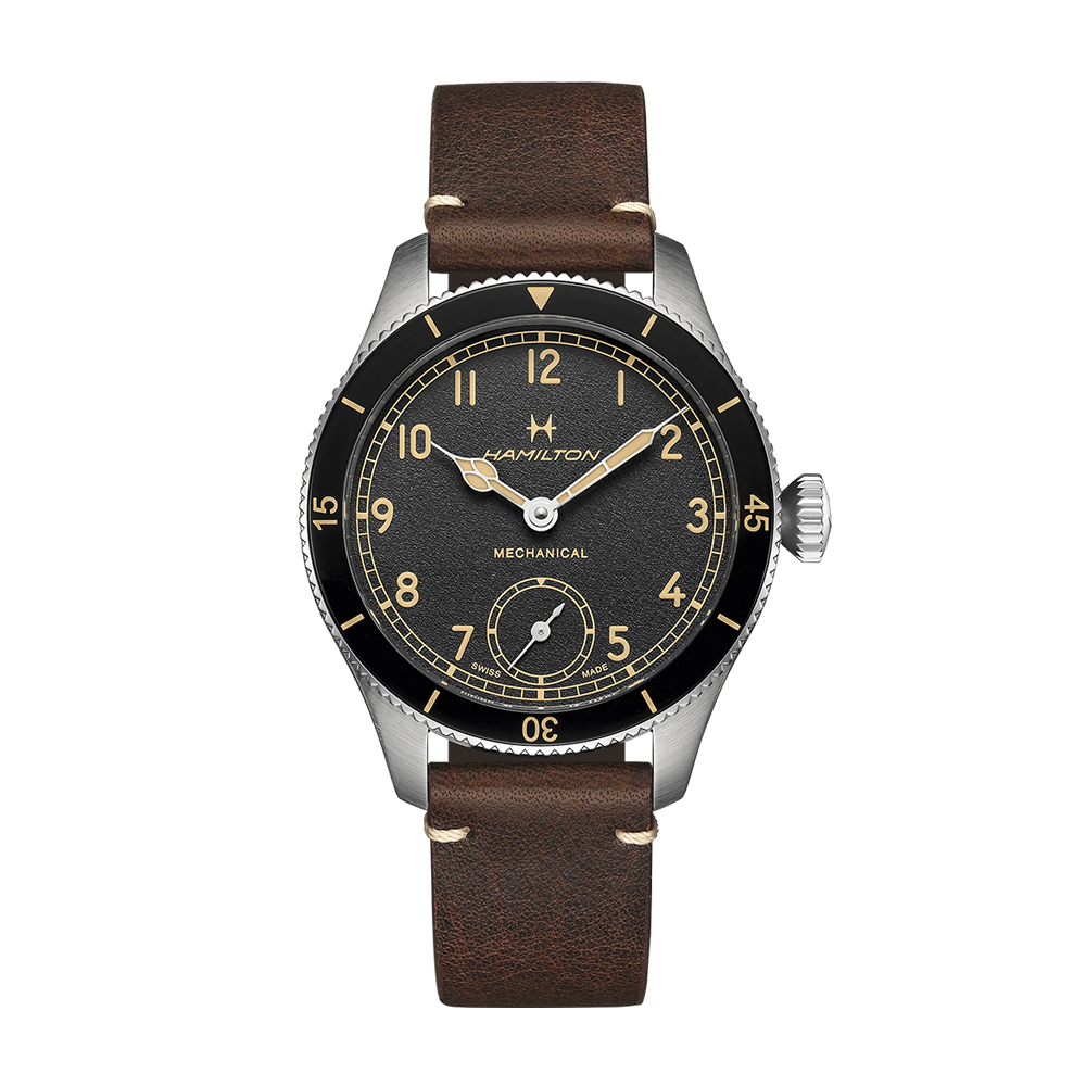 The Hamilton Khaki Aviation Pilot Pioneer watch is powered by a mechanical movement inside of a 43mm stainless steel case. The black dial is protected by sapphire crystal. The brown leather strap is secured with a pin buckle. Water resistant to 100 meters.