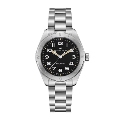 This Hamilton Khaki Field Expedition Auto watch is powered by an automatic movement within a 41mm stainless steel case with a rotating compass bezel. The black dial is covered with sapphire crystal. The stainless steel bracelet leads to a deployant clasp. Water resistant to 100 meters.