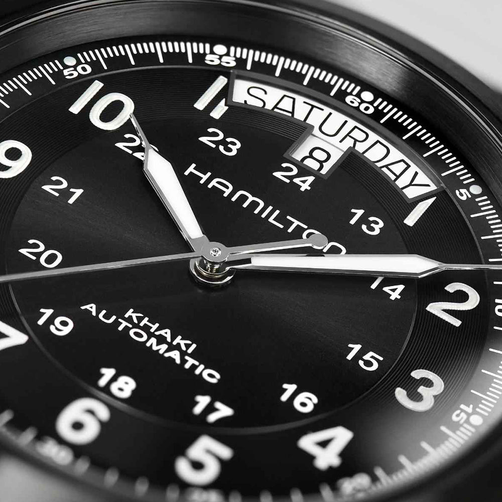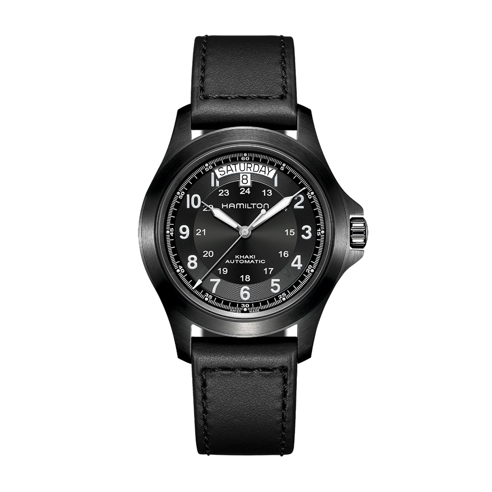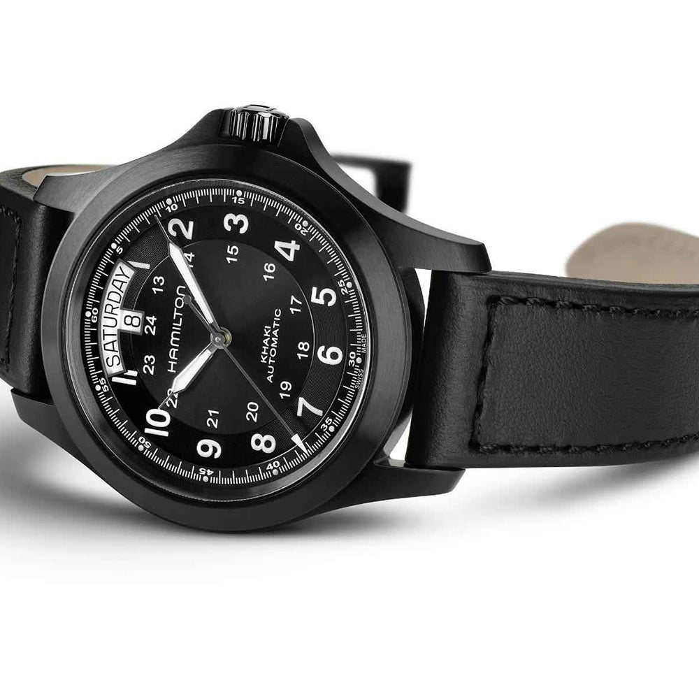 The Hamilton Khaki Field King watch is powered by an automatic movement within a 40mm black PVD-coated stainless steel case. The black dial features a date and day display at the top. The dial is protected by sapphire crystal. The black leather strap is secured by a pin buckle. Water resistant to 50 meters.