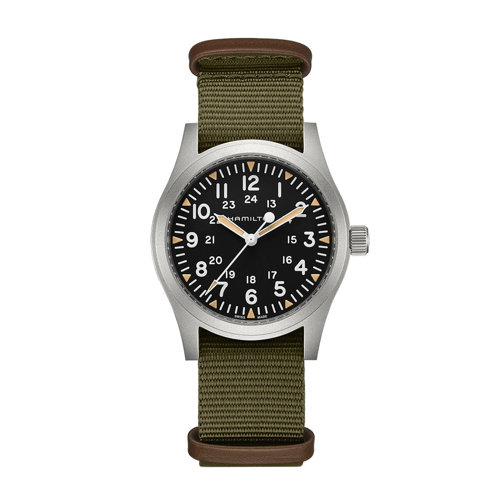 The Hamilton Khaki Field Mechanical watch features a hand-wound mechanical movement within a 42mm stainless steel case. The black dial is protected by sapphire crystal. The green nato strap includes a pin buckle. Water resistant to 50 meters.