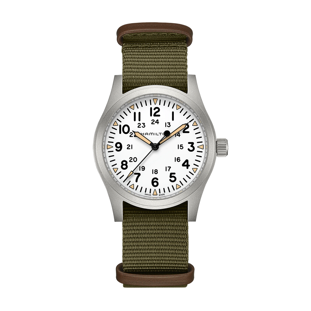 The Hamilton Khaki Field Mechanical has a handwinding movement inside of a 42mm stainless steel case. The white dial is covered with sapphire crystal. The green NATO strap includes a pin buckle. Water resistant to 50 meters.