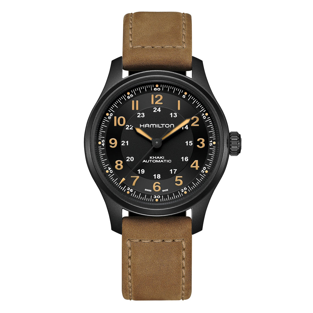 This Hamilton Khaki Field Titanium Auto is powered by an automatic movement contained within a 42mm titanium case. The black dial is covered by sapphire crystal. The brown leather strap leads to a tang buckle. Water resistant to 100 meters.
