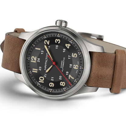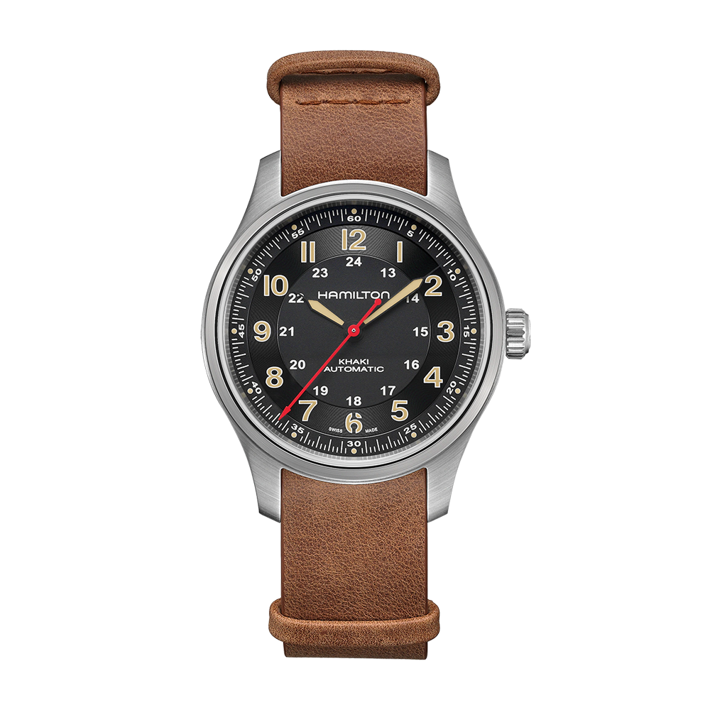 The Hamilton Khaki Field Titanium Far Cry® 6 Limited Edition watch features an automatic movement inside of a 42mm titanium case. The black dial is covered by sapphire crystal. The leather Nato strap has a pin buckle. Water resistant to 100 meters.