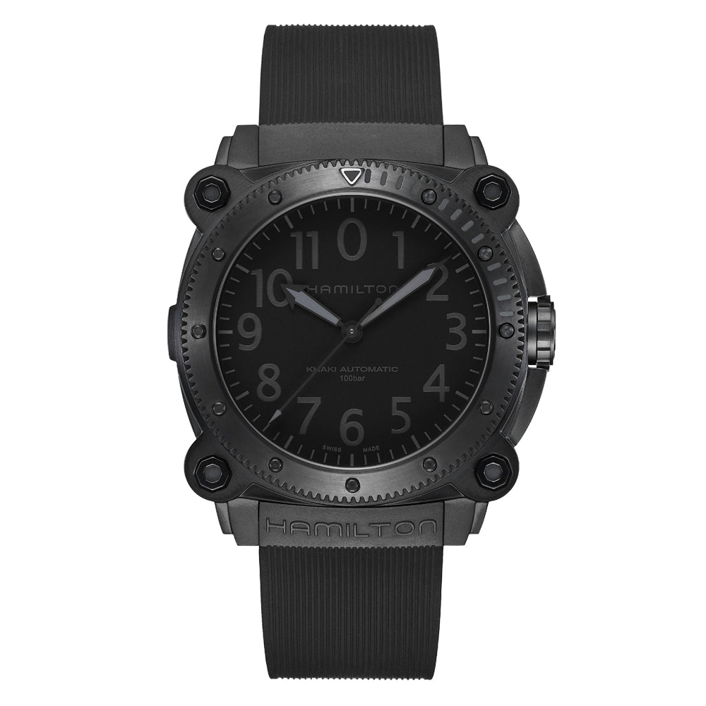 The Hamilton Khaki Navy BeLOWZERO Auto Titanium is powered by an automatic movement contained within a 46mm black-PVD coated titanium case with a rotating bezel. The black dial is protected by sapphire crystal. The black rubber strap has a pin buckle. Water resistant to 1,000 meters.