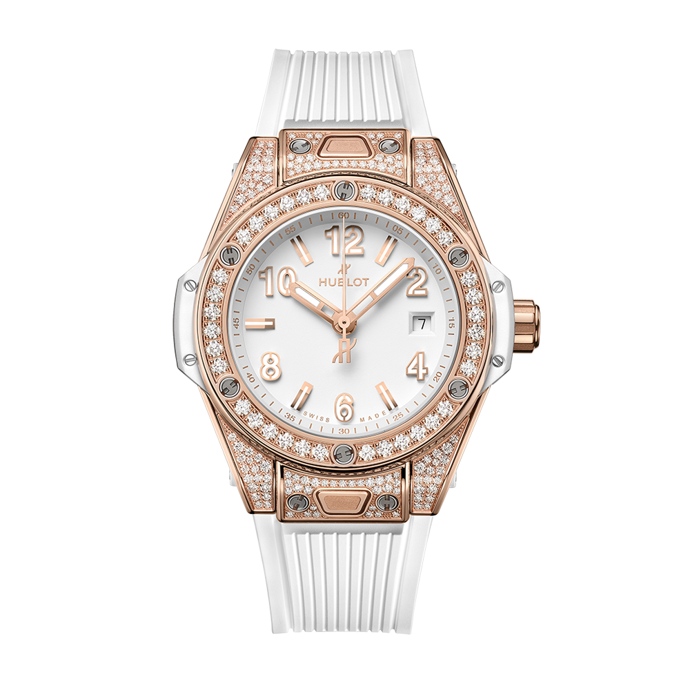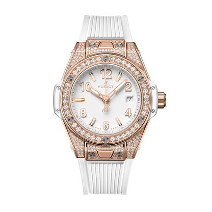 The Hublot Big Bang One Click King Gold White watch features as automatic movement within a 33mm 18K King Gold case set with 130 diamonds. The King Gold bezel is set with an additional 36 diamonds. The total diamond weight of this watch is 1.16 carats. The matte white dial with Arabic numerals reveals a date display. It is protected by an anti-reflective sapphire crystal. The white rubber strap is secured with a King Gold and stainless steel deployant clasp. Water resistant to 100 meters.