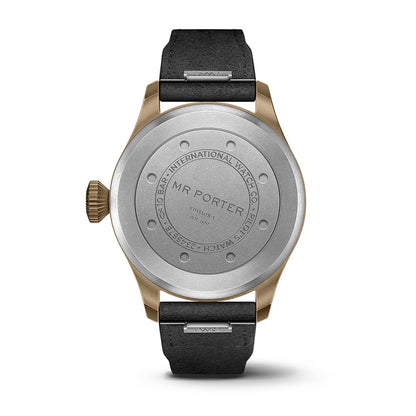 The IWC Big Pilot's Watch 43 Mr Porter Limited Edition has an automatic movement within a 43mm bronze case. The black dial is covered by sapphire crystal. The black alcantara strap has a deployant clasp and is compatible with IWC's EasX-CHANGE system. Water resistant to 100 meters. Limited edition of 500 pieces.