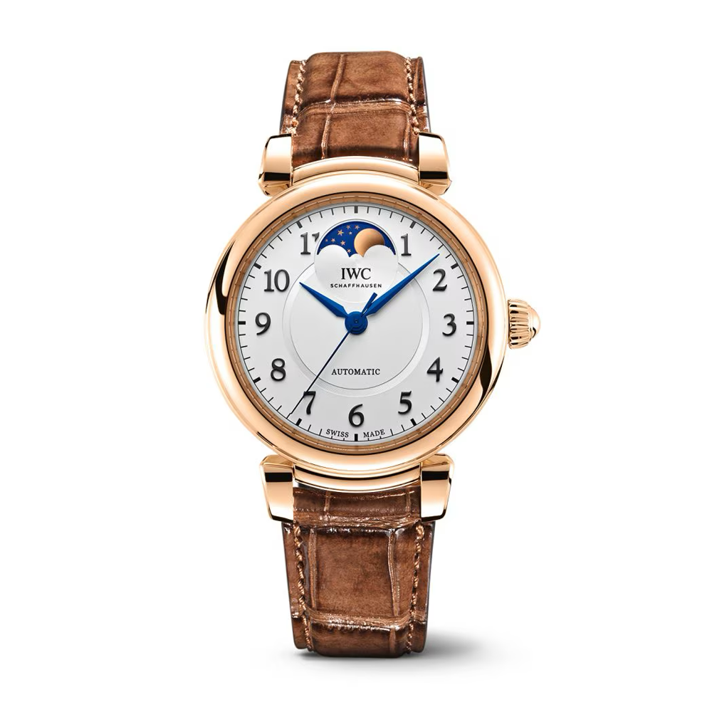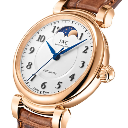 The IWC Da Vinci watch has an automatic movement housed within a 36mm 5N gold case. The silver dial reveals a moon phase complication and is covered by sapphire crystal. The brown leather strap has a 5N gold tang buckle. Water resistant to 30 meters.