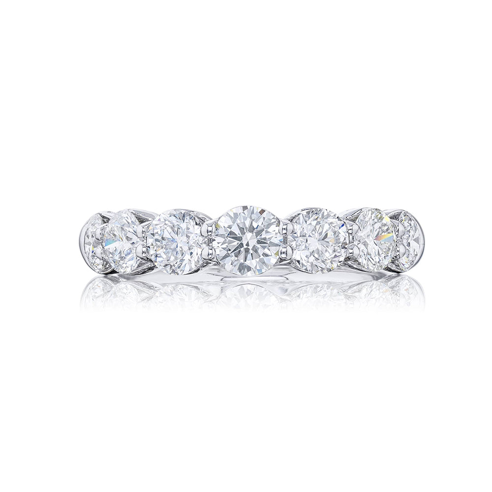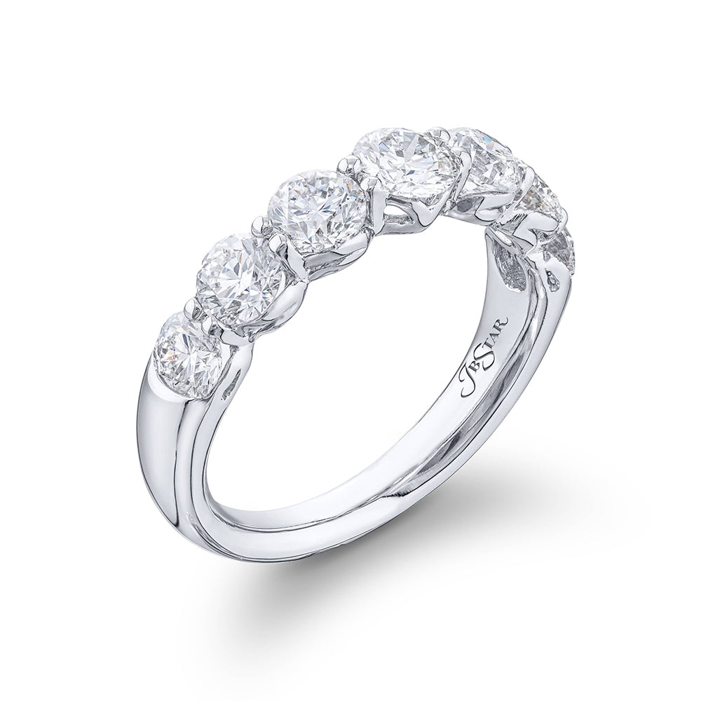 This JB Star seven stone wedding band is crafted in platinum. This wedding ring is set with a total of 1.87 carats of round diamonds that are F-G in color and VS in clarity.