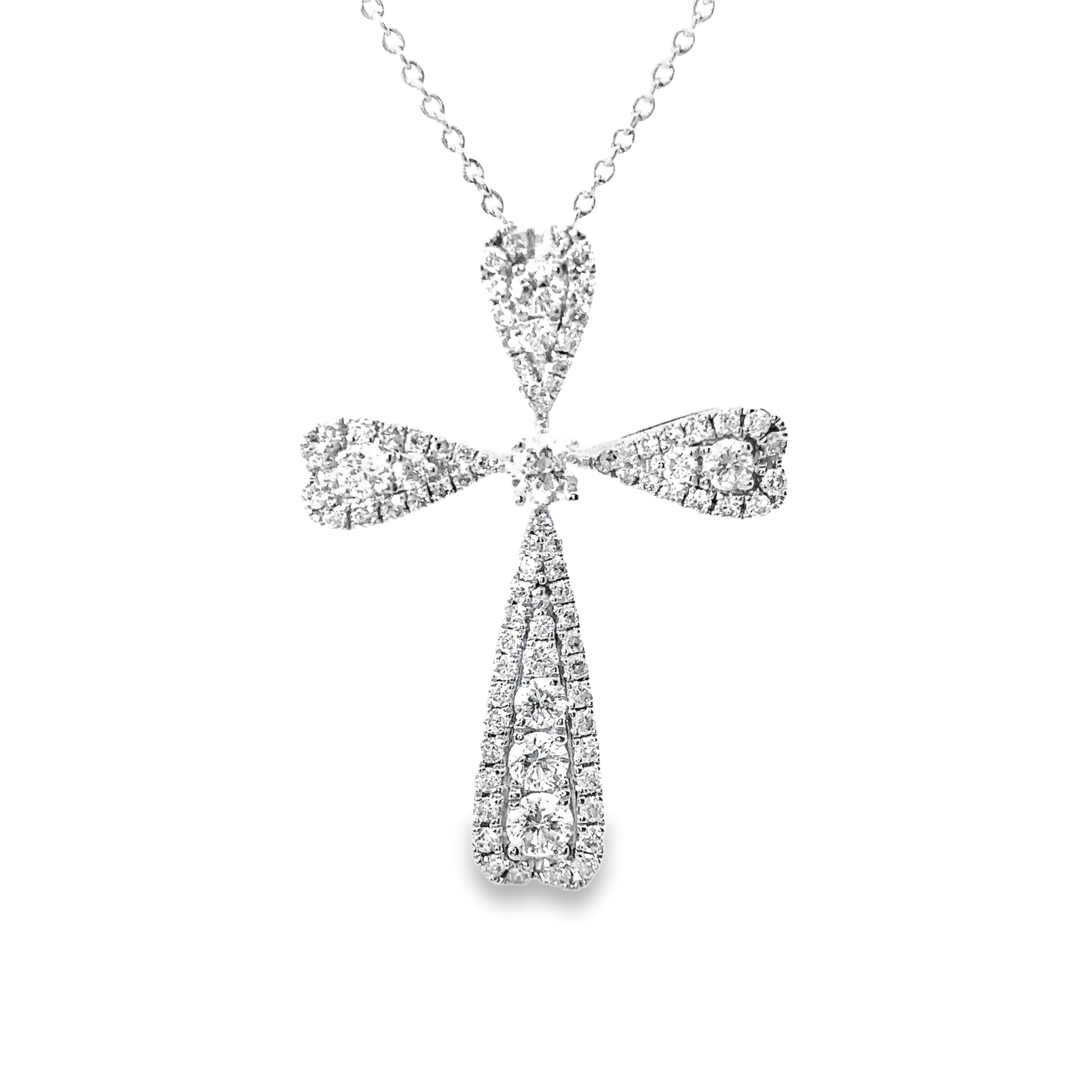 This 18K white gold necklace showcases a graceful diamond cross pendant, set with 0.85 carats total weight of round brilliant diamonds in G-H color. The cross design features elegant tapered lines of pavé-set diamonds, adding brilliance and radiance to a meaningful symbol. Suspended from a matching 18K white gold chain, this piece blends timeless elegance with spiritual significance.