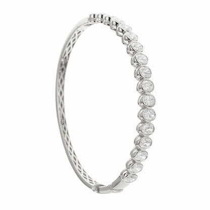 This oval diamond bangle bracelet is crafted in 18K white gold. The bracelet features 4.20 carats of bezel set oval diamonds that are G-H in color and of SI clarity.