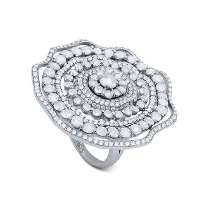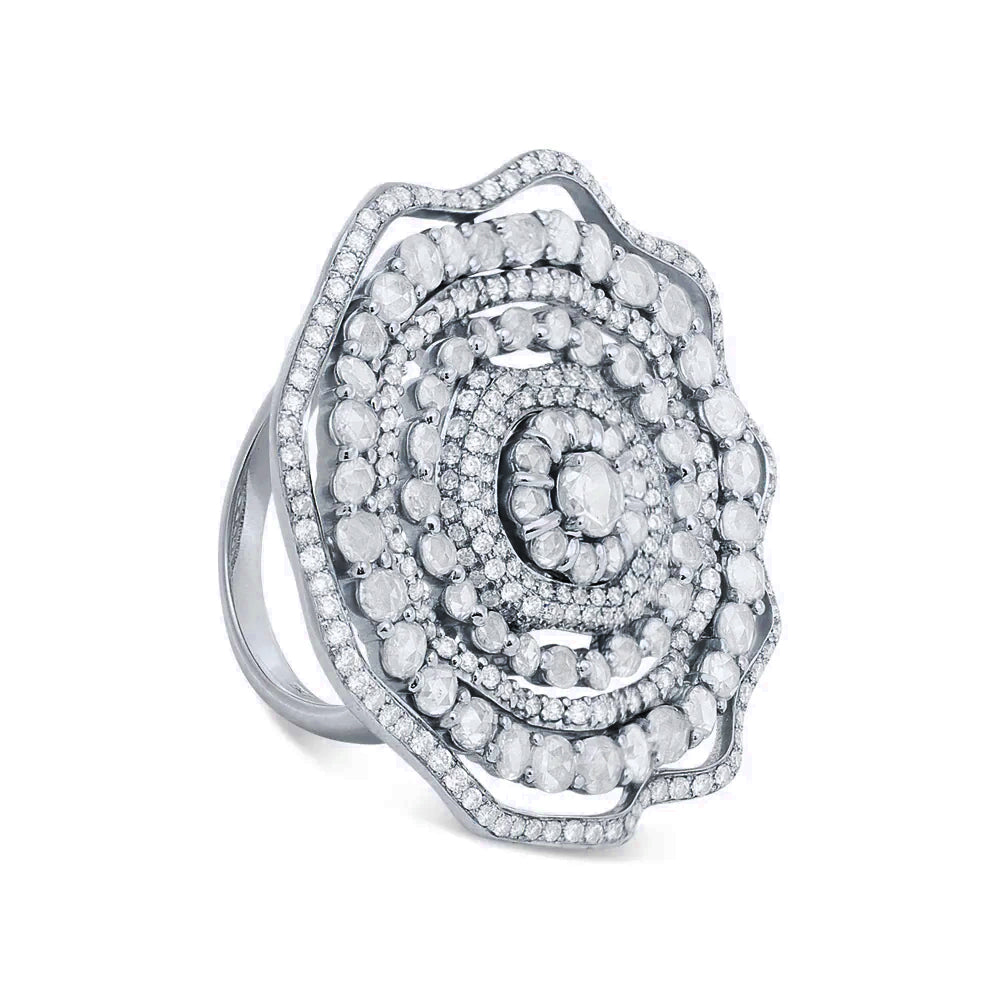 This King Jewelers diamond flower ring is made of 18K white gold. It features rose cut and round brilliant cut diamonds.
