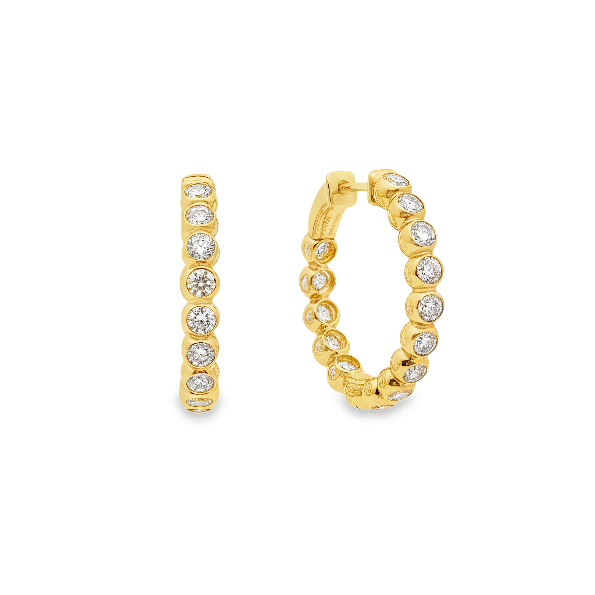 These stunning diamond hoop earrings are crafted in 14K yellow gold and feature 2.25 carats of round brilliant bezel-set diamonds that radiate brilliance from every angle. Designed for both comfort and luxury, these gold diamond hoops strike the perfect balance between timeless elegance and contemporary sophistication. Ideal for elevating any look, from everyday wear to evening occasions.