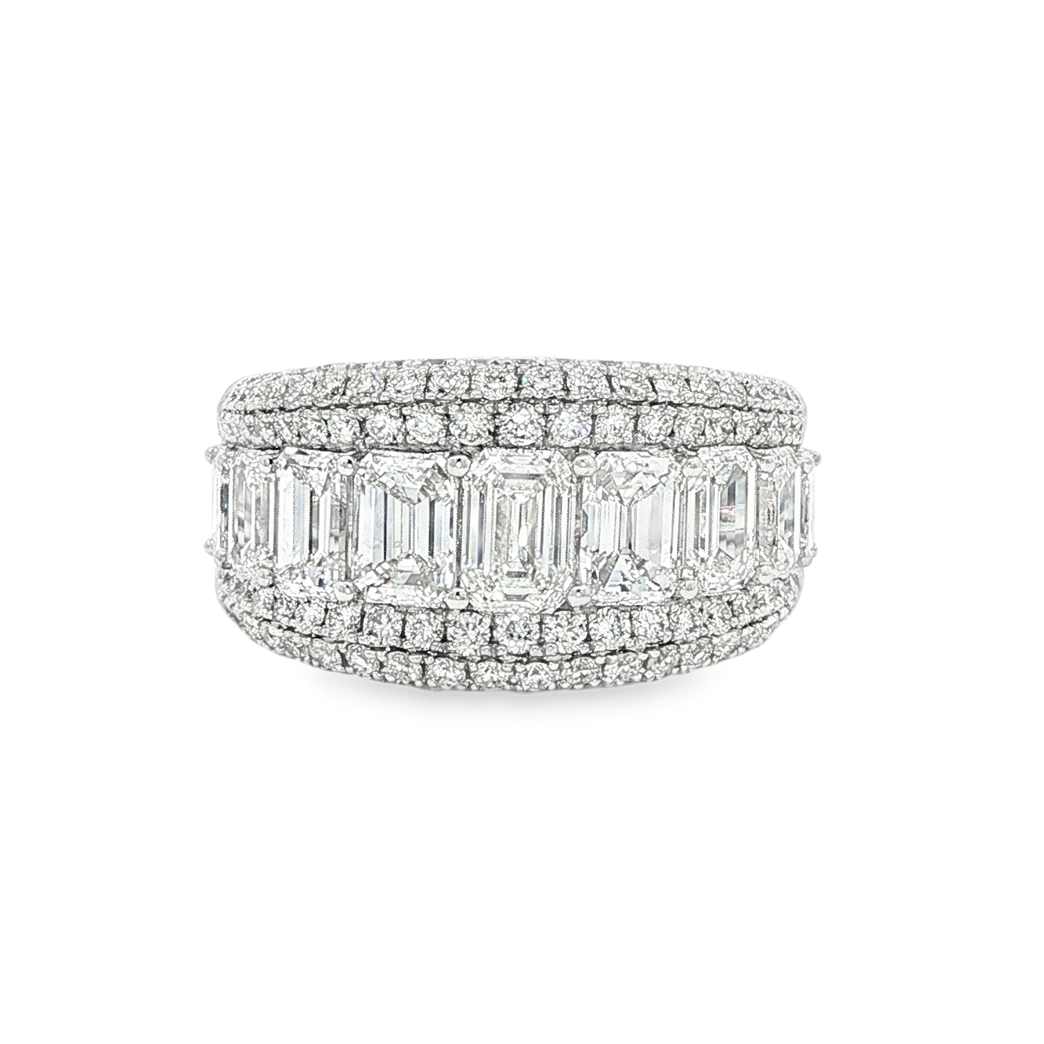 A central row of emerald-cut diamonds anchors the design, their elongated facets creating a striking sense of structure and symmetry. Surrounding pavé-set round diamonds frame the center row above and below, adding layers of radiance and depth that enhance the ring’s sculptural profile.