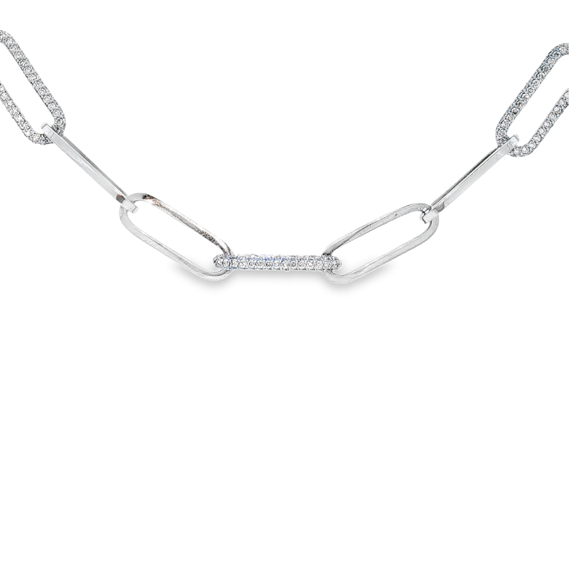 This stunning diamond paperclip necklace is crafted in polished 14K white gold, featuring five pavé diamond links totaling 4.00 carats. Each diamond link adds radiant sparkle to the modern chain design, creating a luxurious yet versatile statement piece. Measuring 18 inches in length, this white gold diamond link necklace is perfect for layering or wearing solo for an effortlessly elegant look.