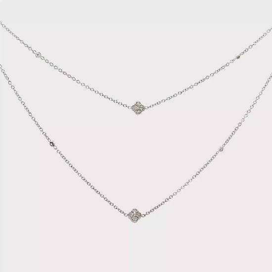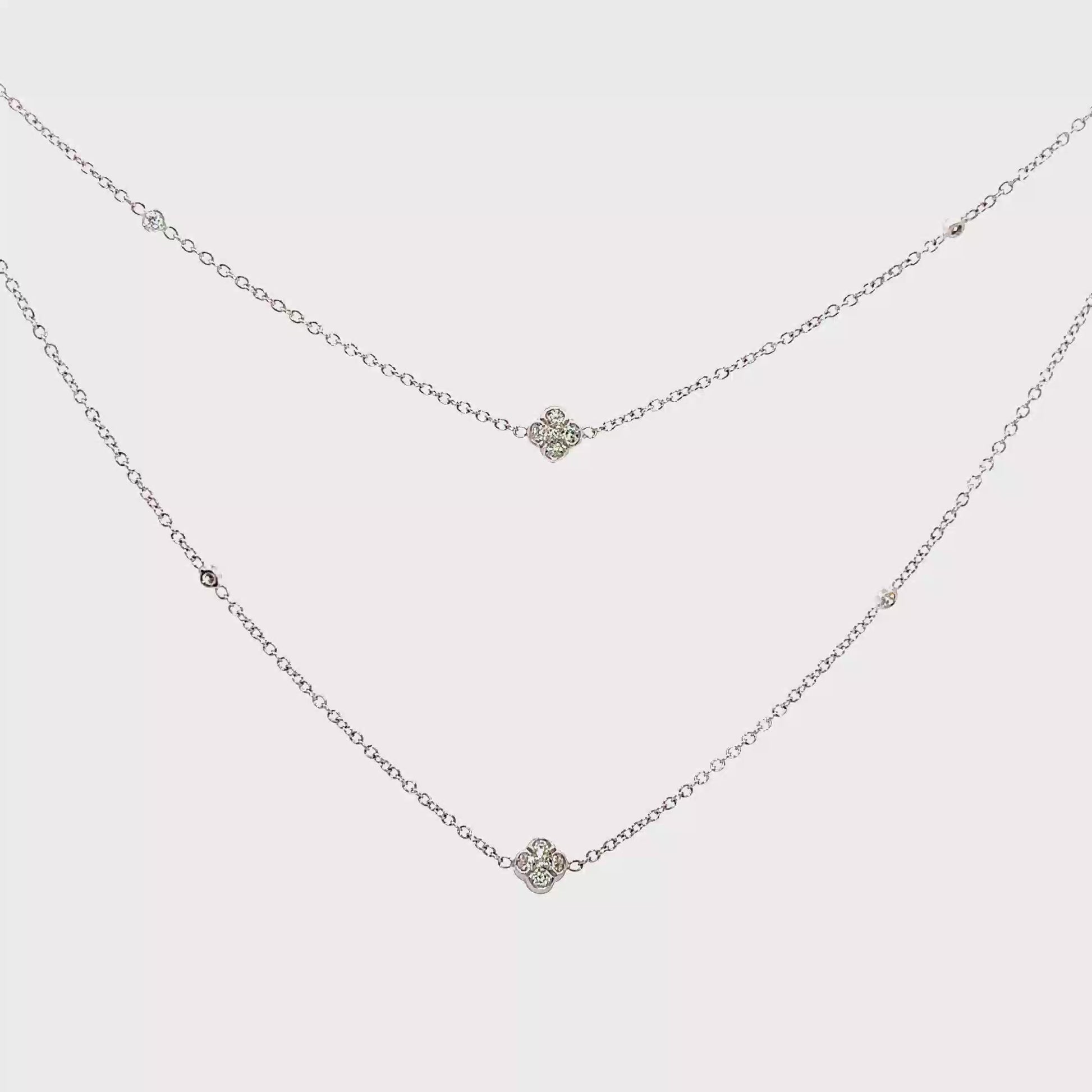 This delicate station necklace is crafted in 18K white gold and adorned with 0.66 carats of diamonds. Featuring clover-shaped diamond stations accented by bezel-set diamonds along the chain, it offers a refined and graceful sparkle. Perfect for layering or as a subtle everyday luxury piece.