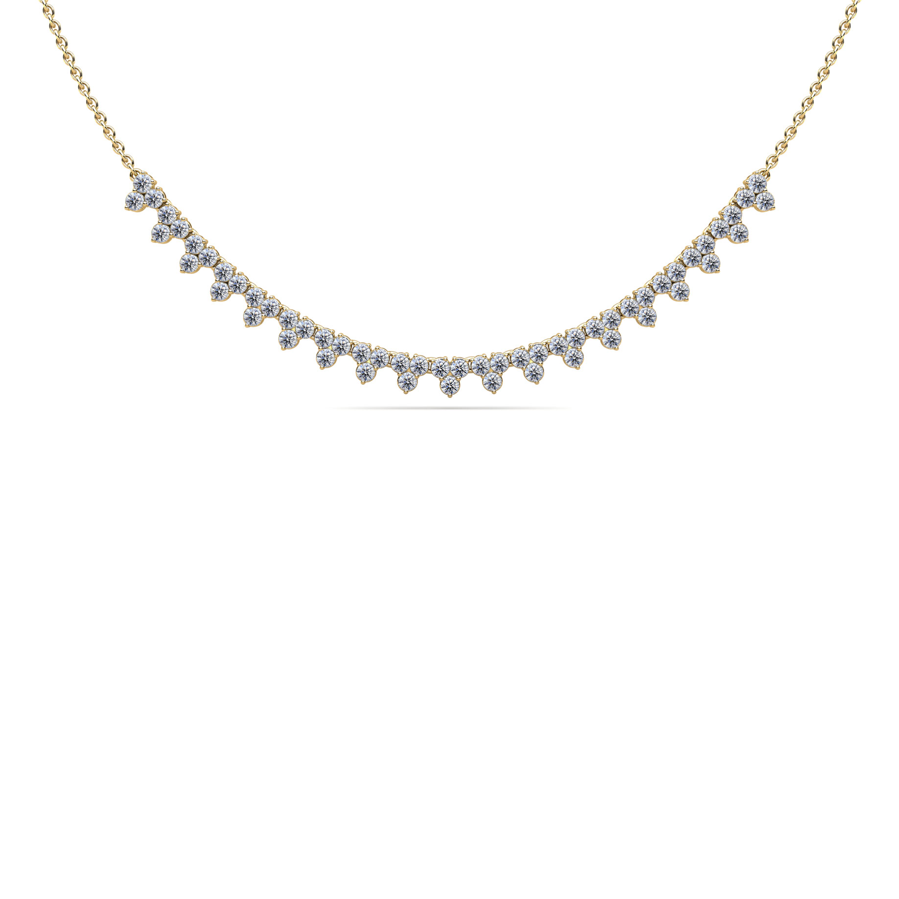 This diamond necklace is made of 14K yellow gold. The necklace features multiple diamond trio pendants totaling 2.98 carats. The diamonds are G-H in color, and of SI clarity.