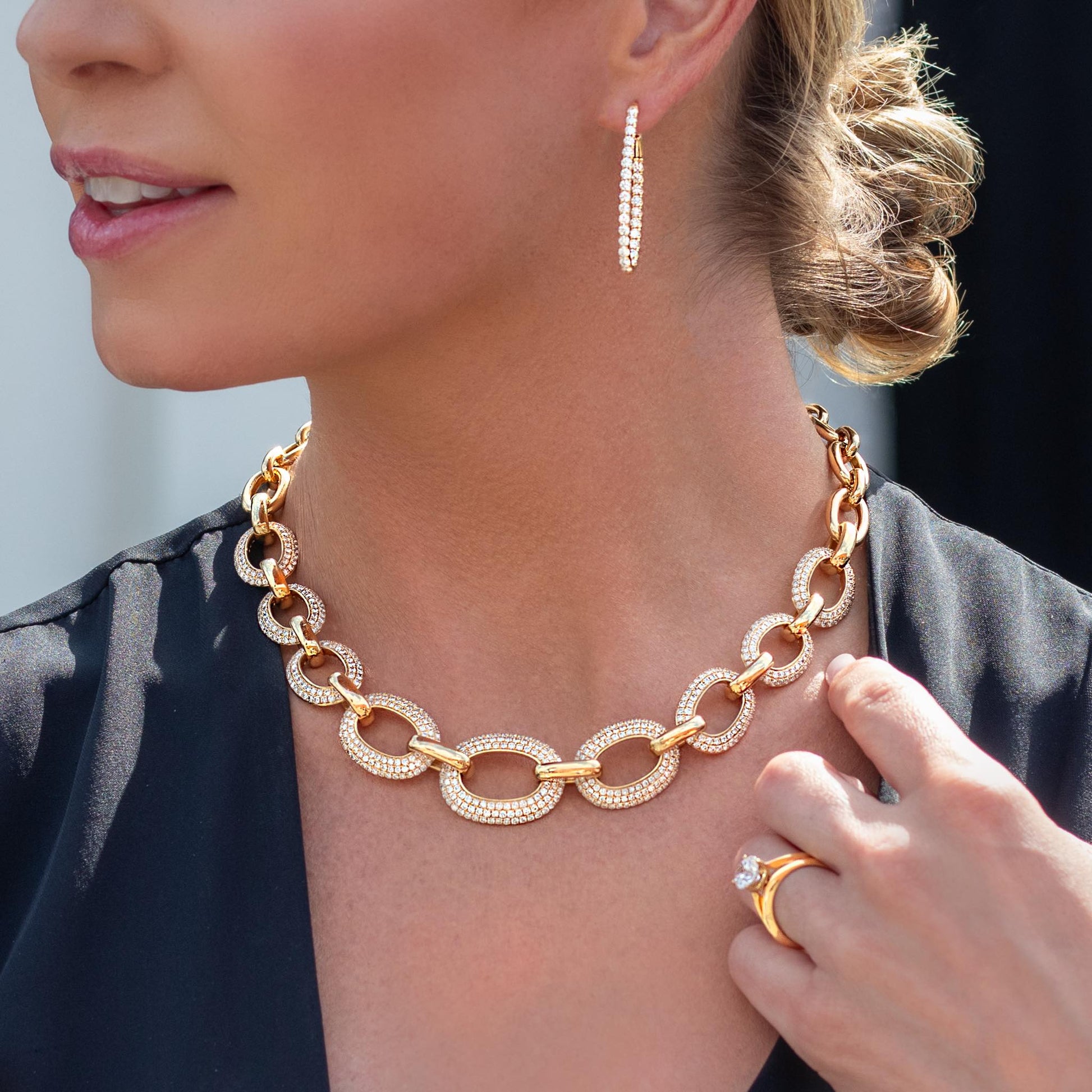 This large oval link chain necklace is made of 18K yellow gold and set with 11.10 carats of G-H color, SI clarity diamonds.