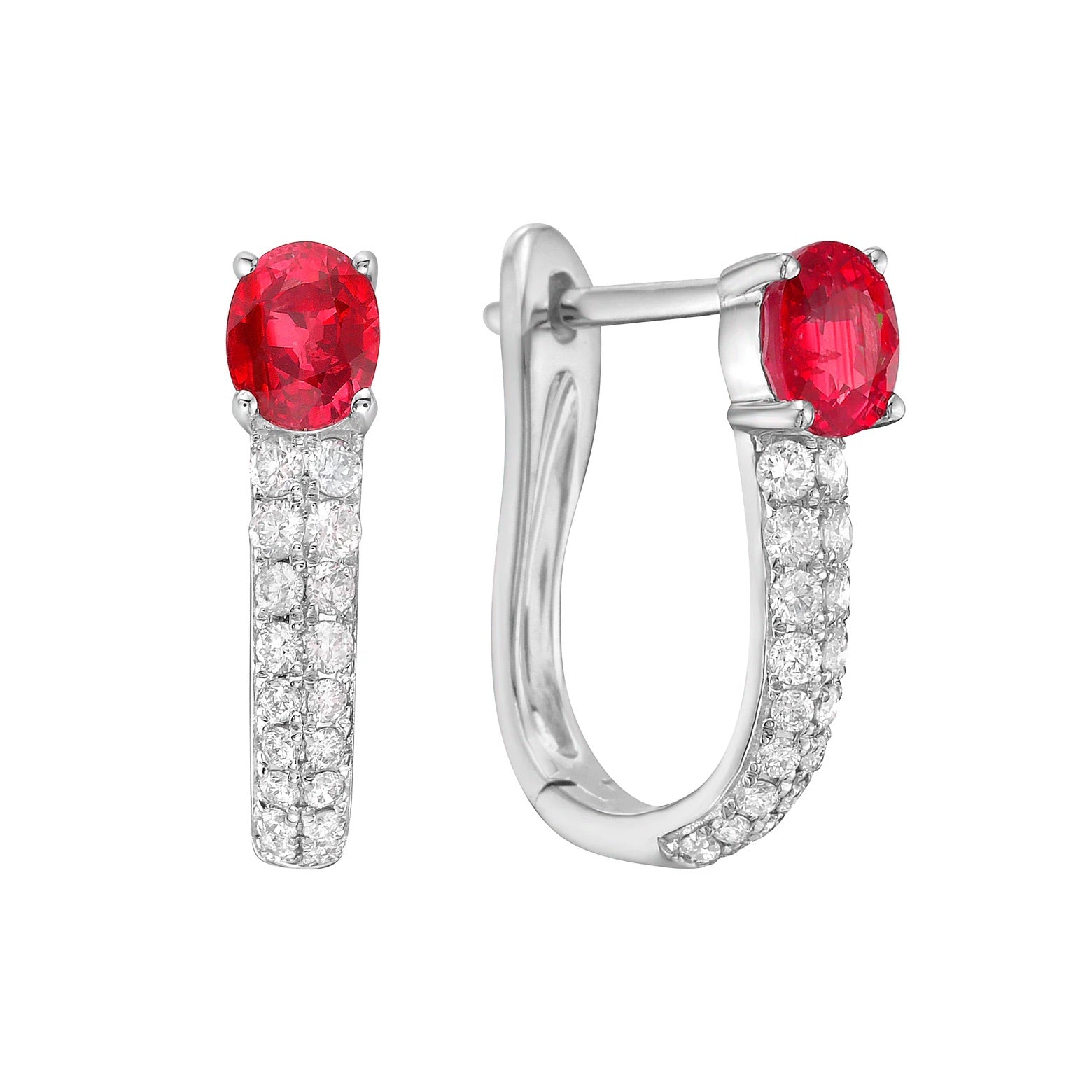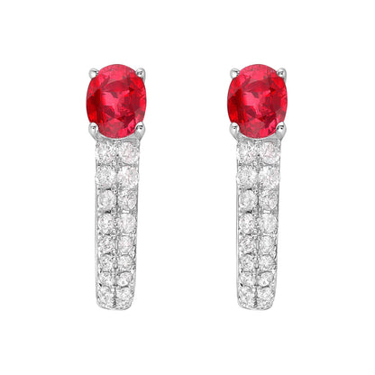 These ruby and diamond huggie earrings are crafted in 14K white gold. The small hoop earrings feature oval cut rubies set above two rows of pave diamonds that extend down the front of the hoop. The earrings have a total ruby weight of 0.82 carats and a total diamond weight of 0.32 carats.