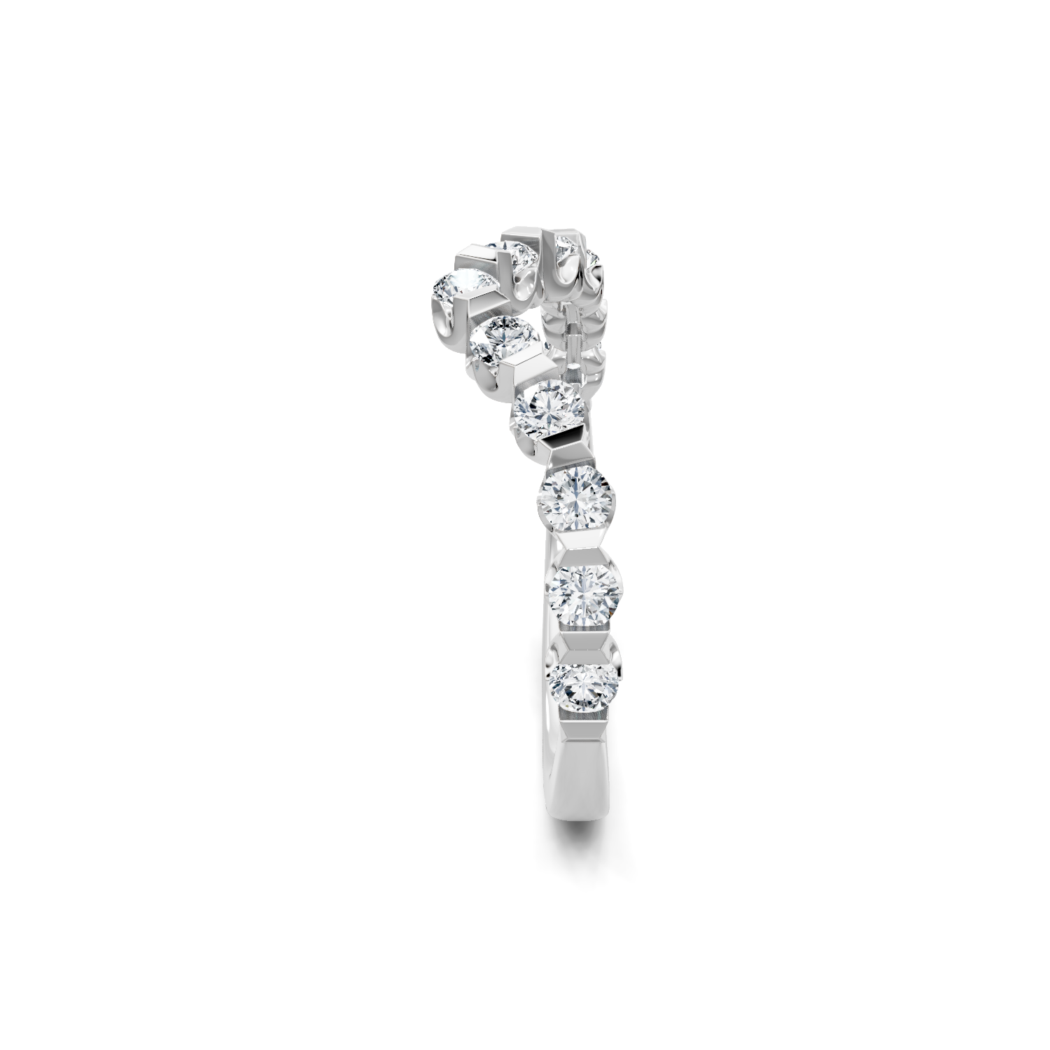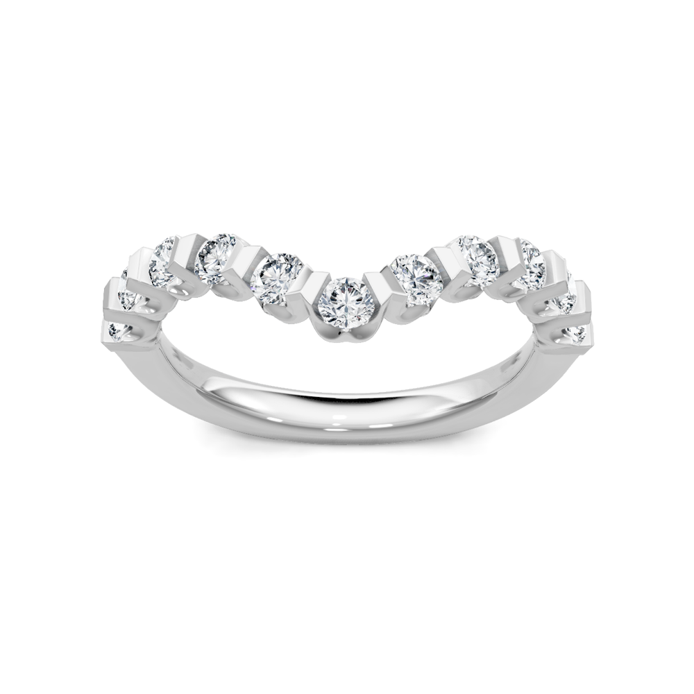 This curved wedding band is comprised of 14K white gold. The ring is set with 0.80 carats of G-H color, SI clarity diamonds.