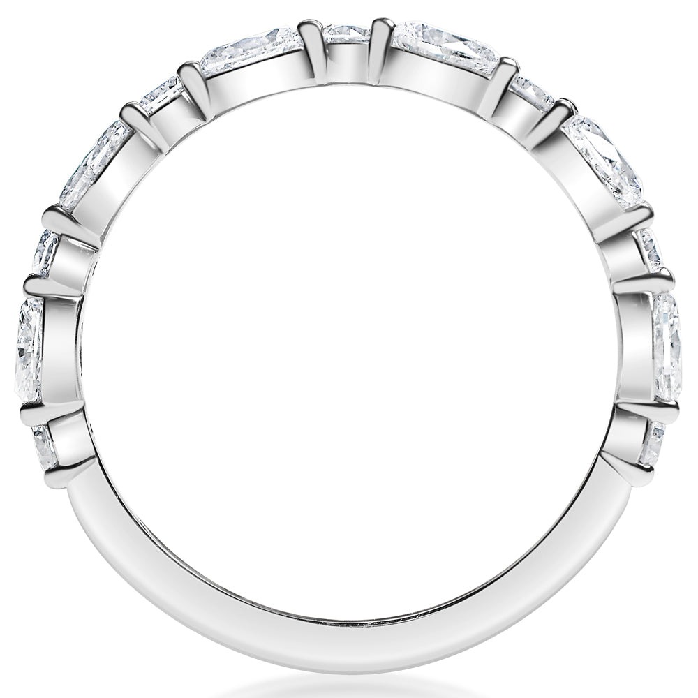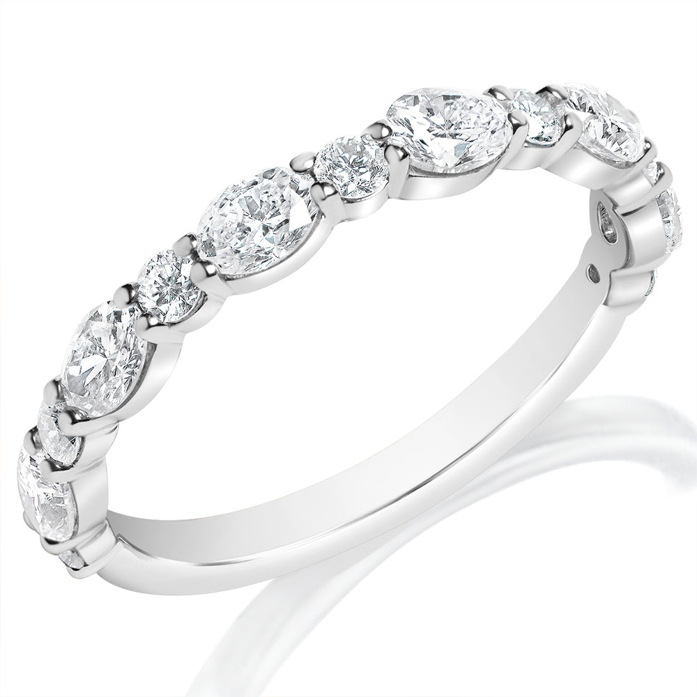 This KJ5 wedding band is set with alternating round and oval diamonds that are G-H in color and SI in clarity halfway around the band. This 14K white gold wedding ring has a total diamond weight of 1.04 carats.