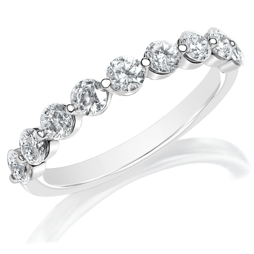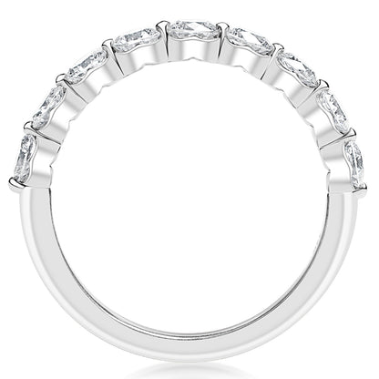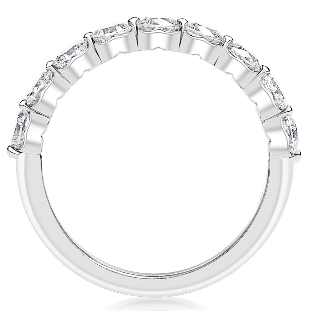 This KJ5 wedding band is set with nine round diamonds halfway around the band which are G-H in color and SI in clarity. This 14K white gold wedding ring has a total diamond weight of 0.98 carats.