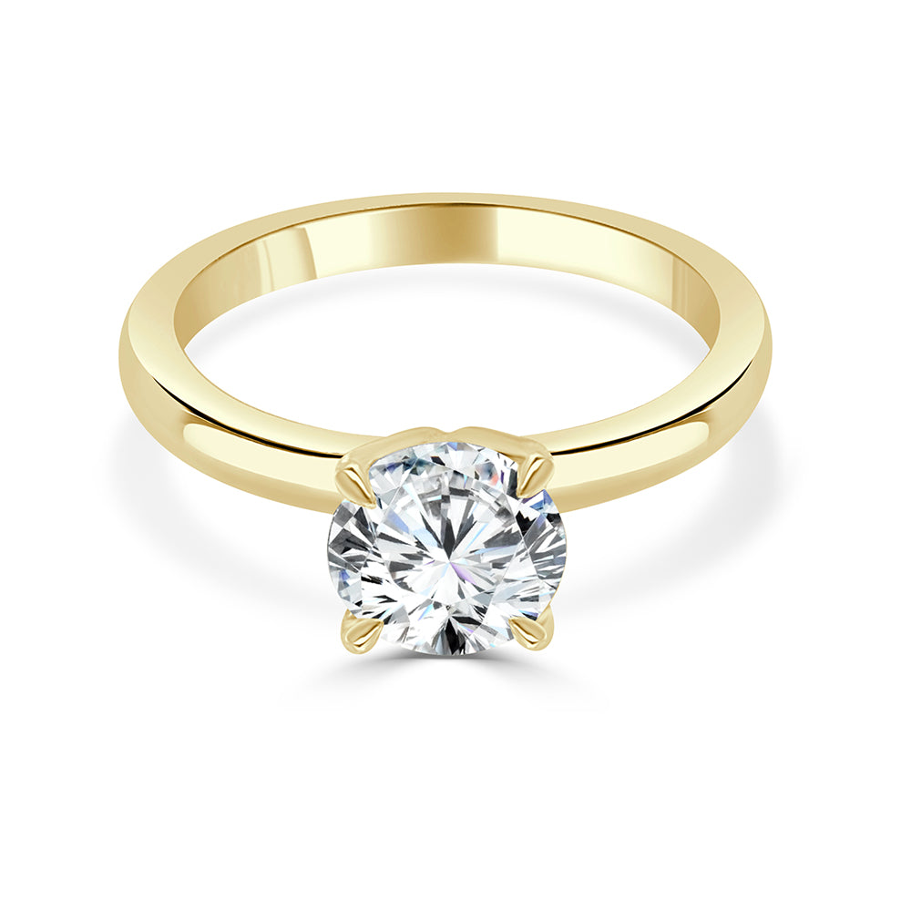 This KJ5 engagement ring mounting is crafted in 14K yellow gold. The solitaire semi-mount is designed to fit a round 1.5 carat center stone. This listing is for a mounting only, center stone not included.