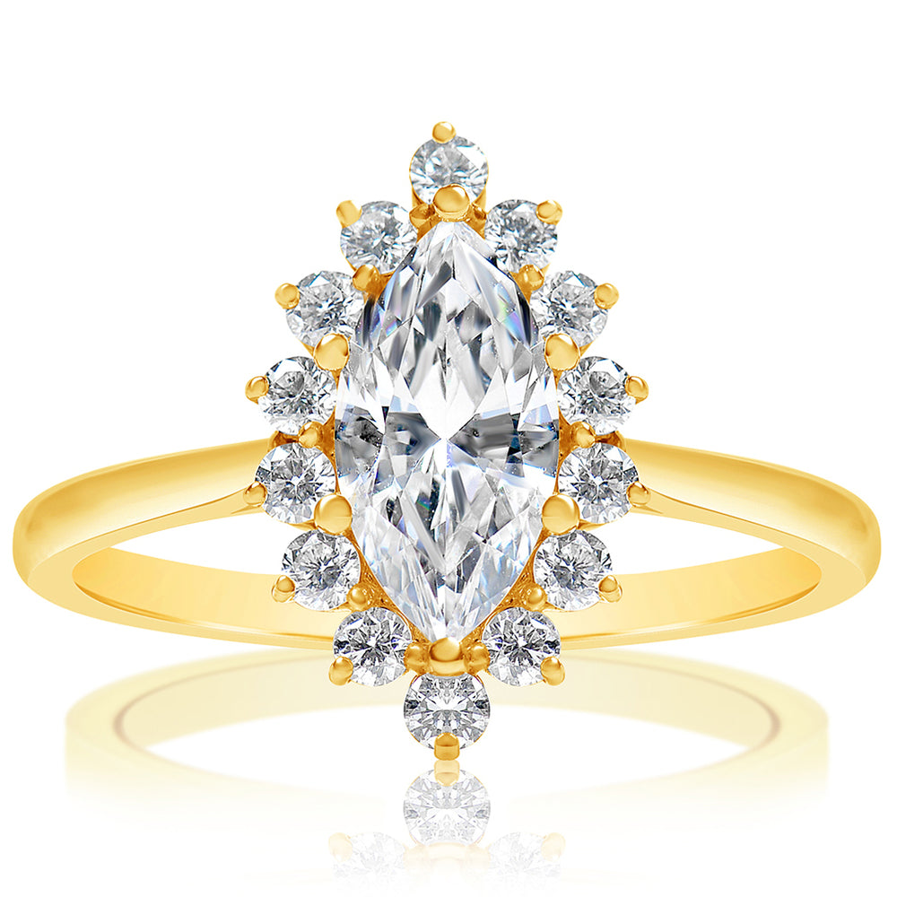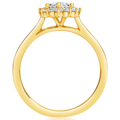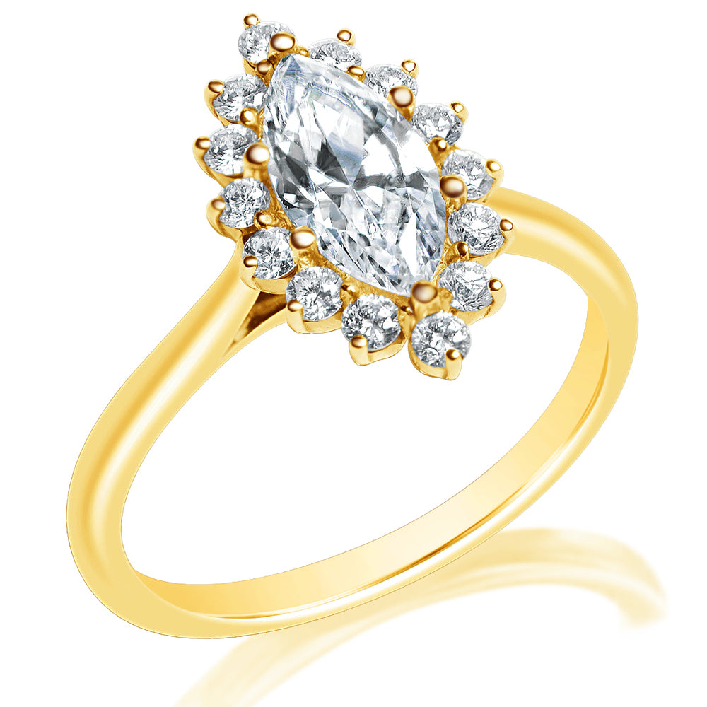 This KJ5 engagement ring mounting is crafted in 14K yellow gold. It is meant to hold a marquise center stone, which is not included with the purchase of this mounting. It features a marquise-shaped diamond halo set with G-H color, SI clarity round diamonds. This engagement ring setting has a total diamond weight of 0.57 carats.