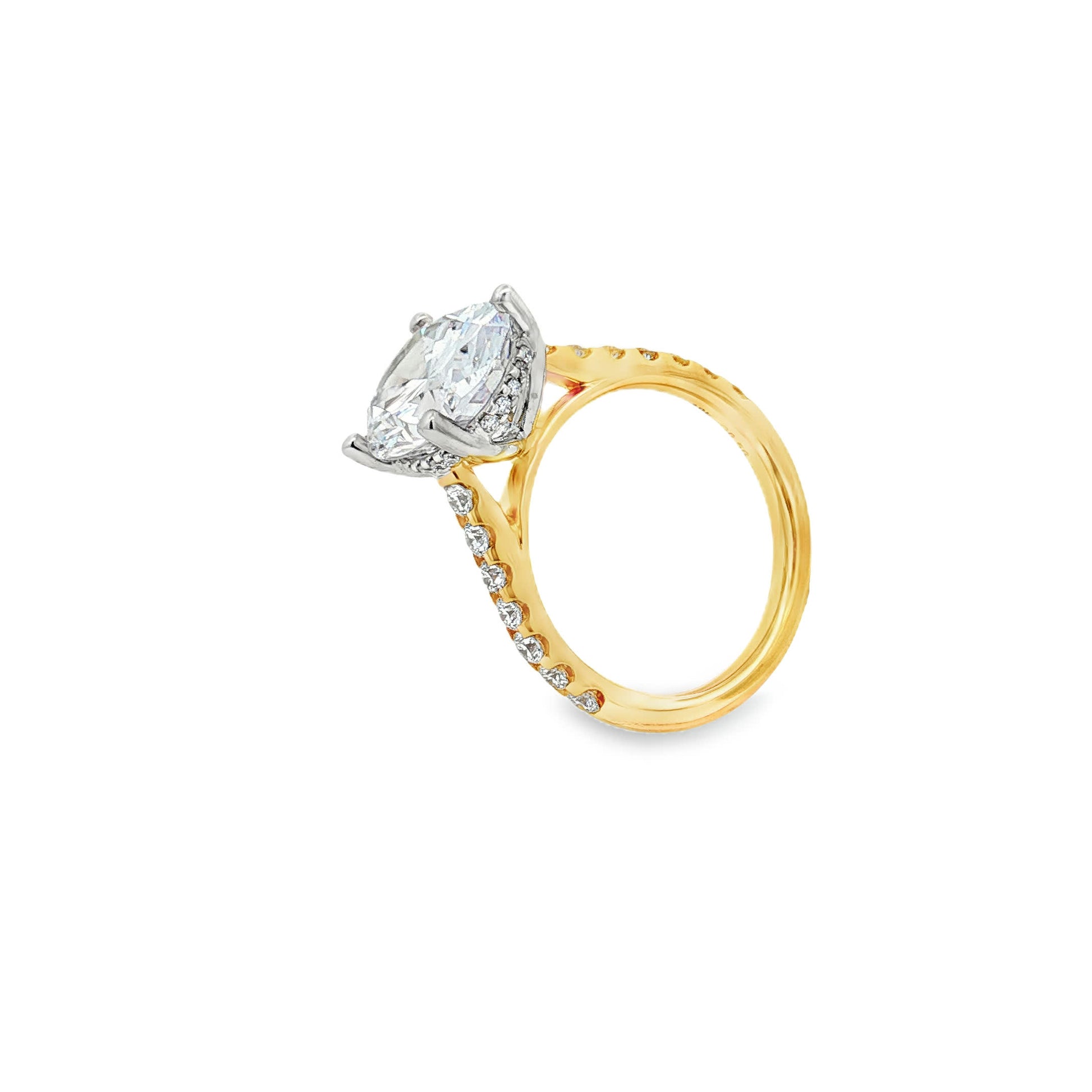 This KJ5 engagement ring is crafted in 18K Yellow Gold and is designed to hold a oval center stone. The shank features 0.58 carats of pave diamonds. This engagement ring mounting does not include the center diamond.
