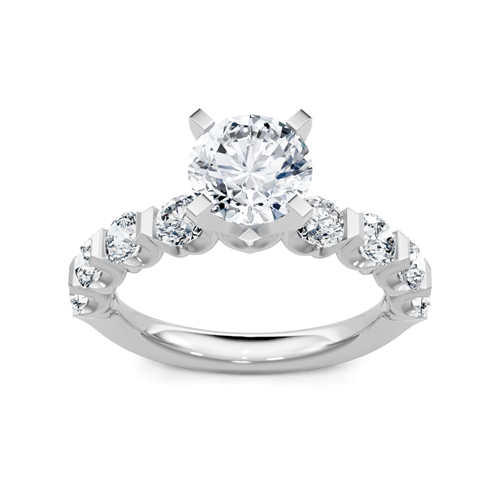 This classic engagement ring mounting is comprised of 14K white gold. The ring is meant to hold a round center stone in a four prong setting. The shank of the ring is set with 0.50 carats of G-H color, SI clarity round diamonds in shared prong settings. Center diamond not included.