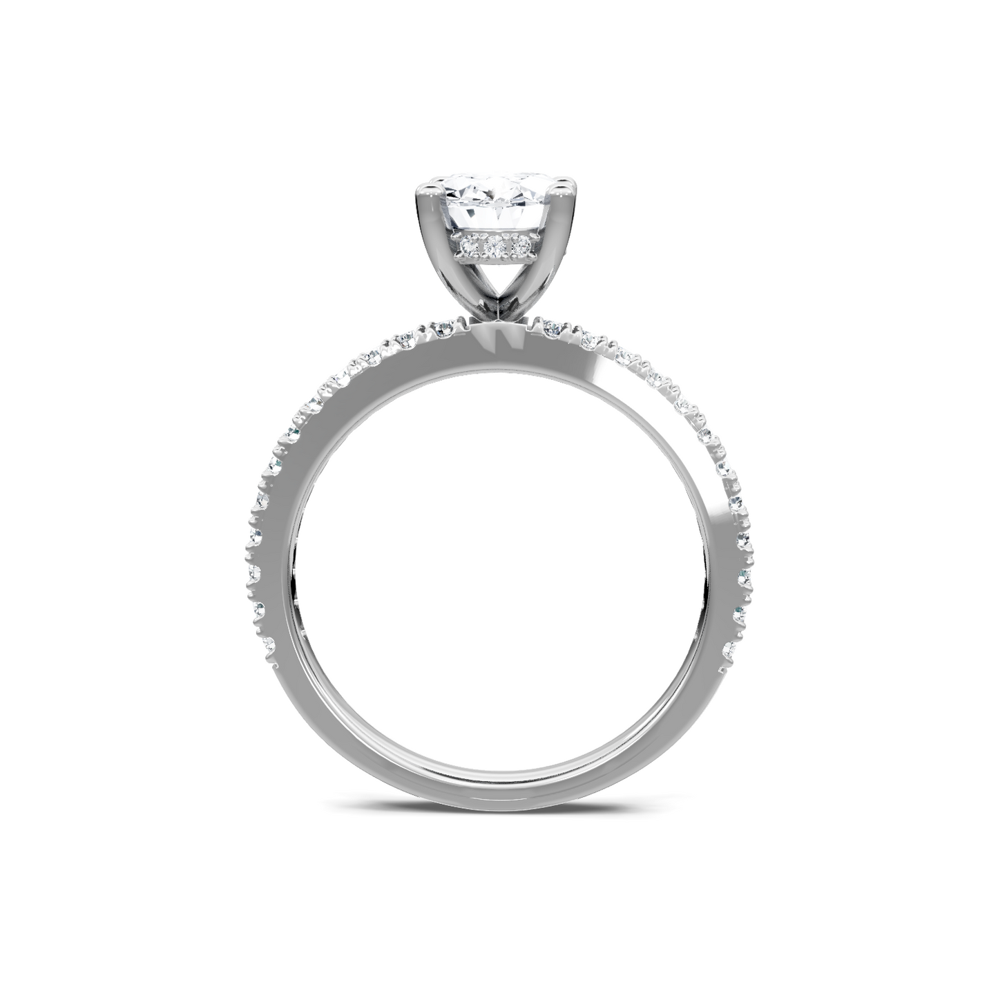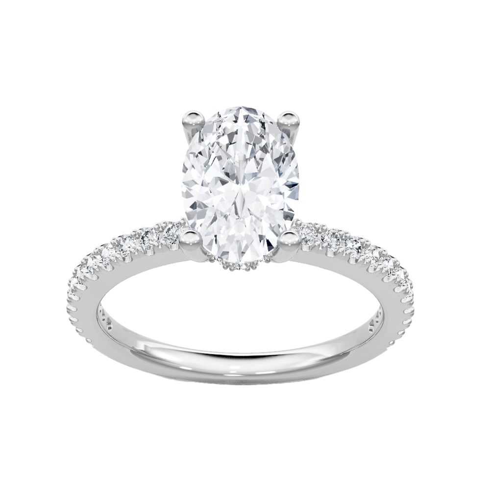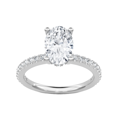 This classic engagement ring mounting is made of 14K white gold. The ring is designed to hold an oval diamond in a four-prong setting with a hidden diamond halo. The shank of the ring is adorned with additional round diamonds. This semi-mount has a total diamond weight of 0.33 carats. Center diamond sold separately.