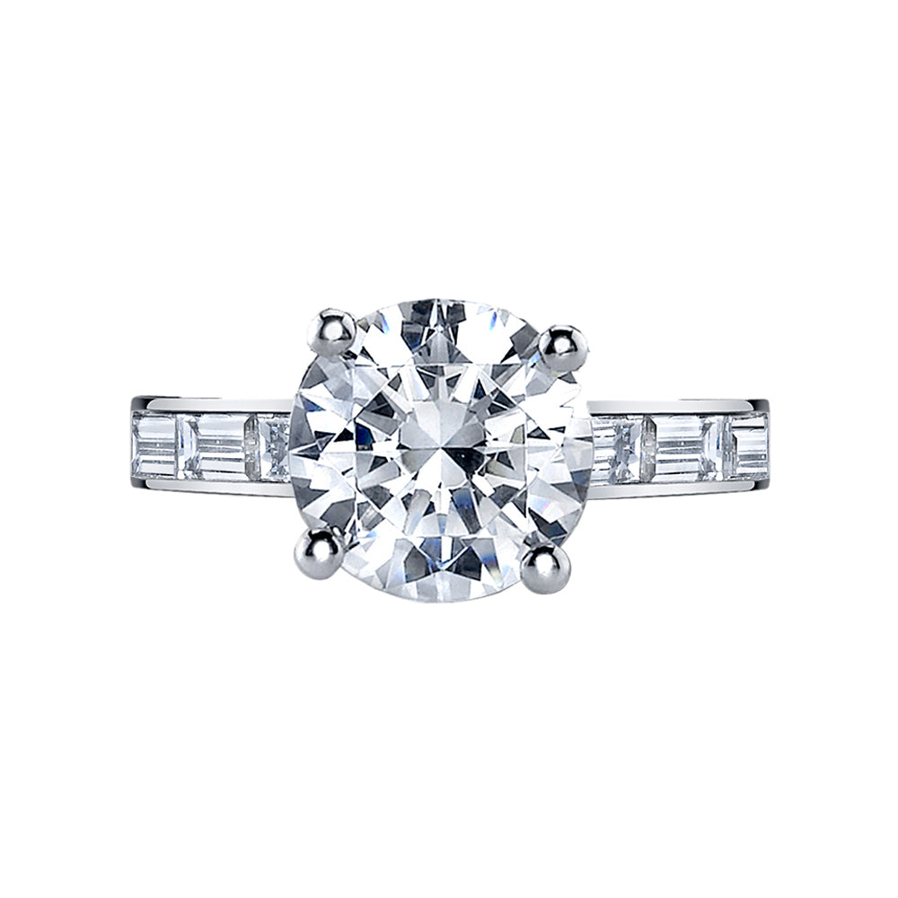 This engagement ring mounting is meant to hold a round center stone in a platinum 4 prong setting. The shank of the ring is adorned with 1 carat of G-H color, SI clarity channel set baguette diamonds. The total diamond weight of this mounting is 1 carat. Center diamond sold separately.