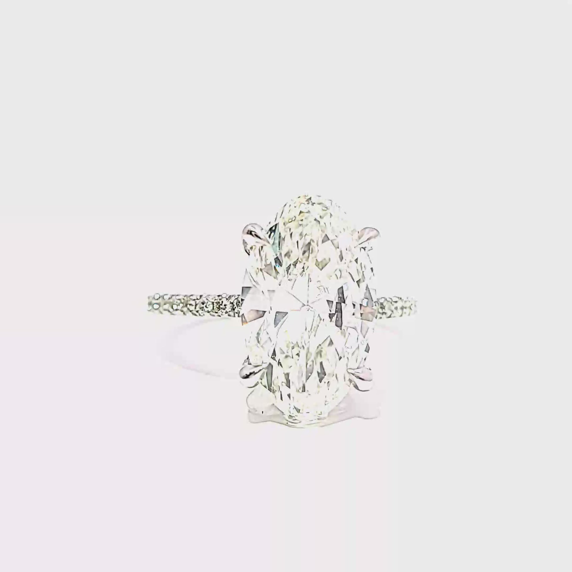 This platinum engagement ring features a stunning 5.21 carat GIA certified oval cut diamond that is J in color and of SI1 clarity as its centerpiece. The elongated oval diamond center stone is secured in a classic four-prong setting, allowing maximum brilliance and fire. The shank is adorned with 0.50 carats total weight of white pavé-set diamonds, adding a touch of shimmer and sophistication. A remarkable ring that radiates beauty and distinction.