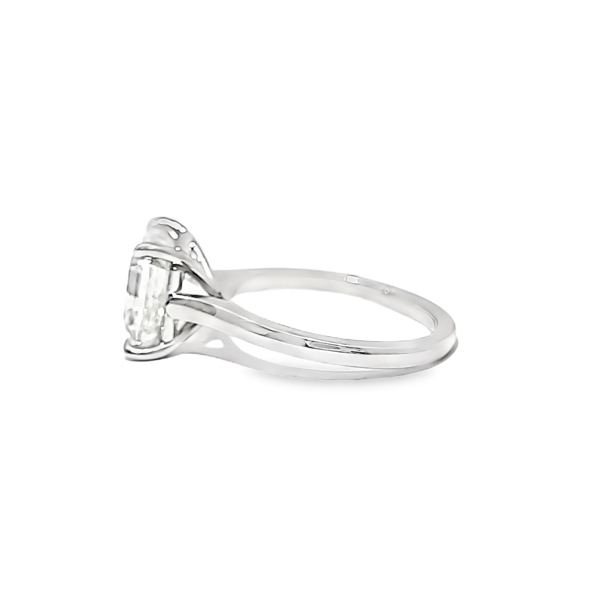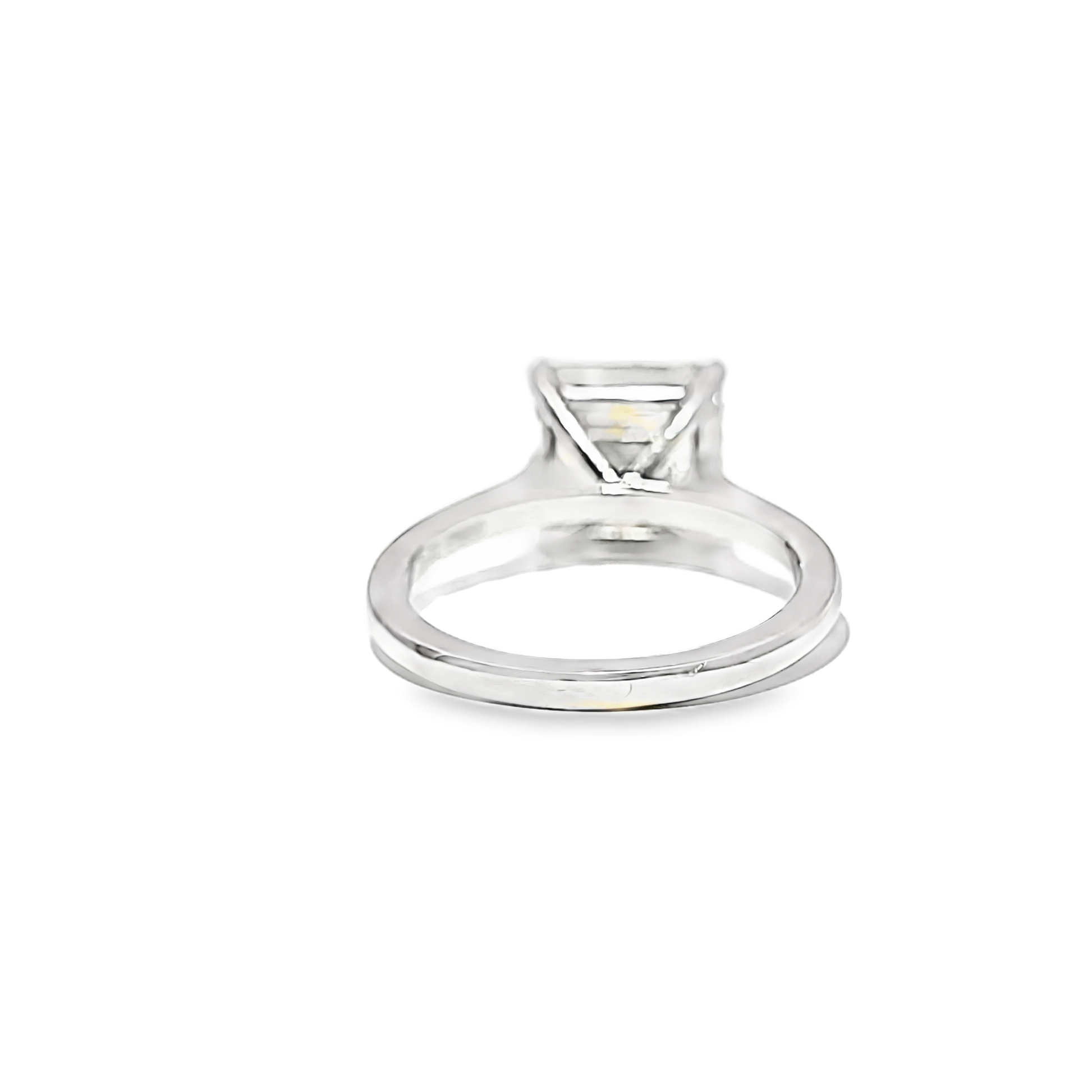 This platinum solitaire engagement ring showcases a magnificent 5.22 carat GIA certified I color, SI2 clarity, Asscher cut diamond. The striking step-cut facets of the Asscher diamond create a hall-of-mirrors effect, emphasizing its brilliance and depth. Set in a refined platinum four-prong design, this ring highlights the bold geometry of the cut while keeping the focus on the extraordinary center stone.