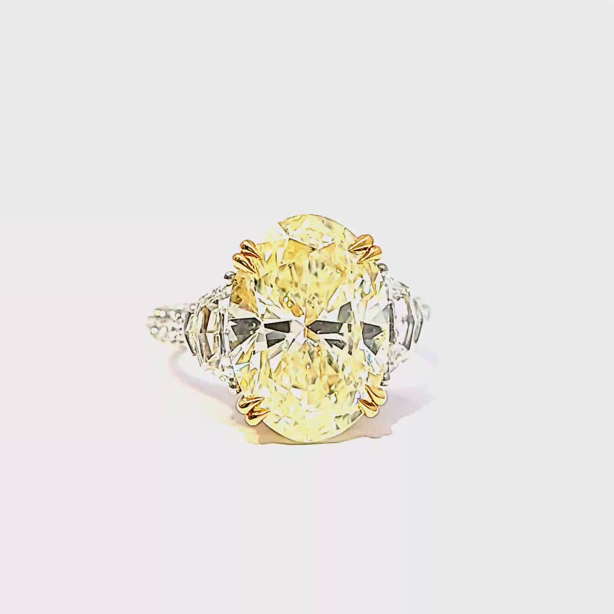 Celebrate everlasting love with this extraordinary platinum and 18K yellow gold three stone engagement ring. At its center rests a 6.17 carat GIA certified fancy light yellow oval cut, SI1 diamond, secured in rich yellow gold prongs. The vibrant centerpiece is flanked by 0.75 carats of cadillac cut side diamonds...
