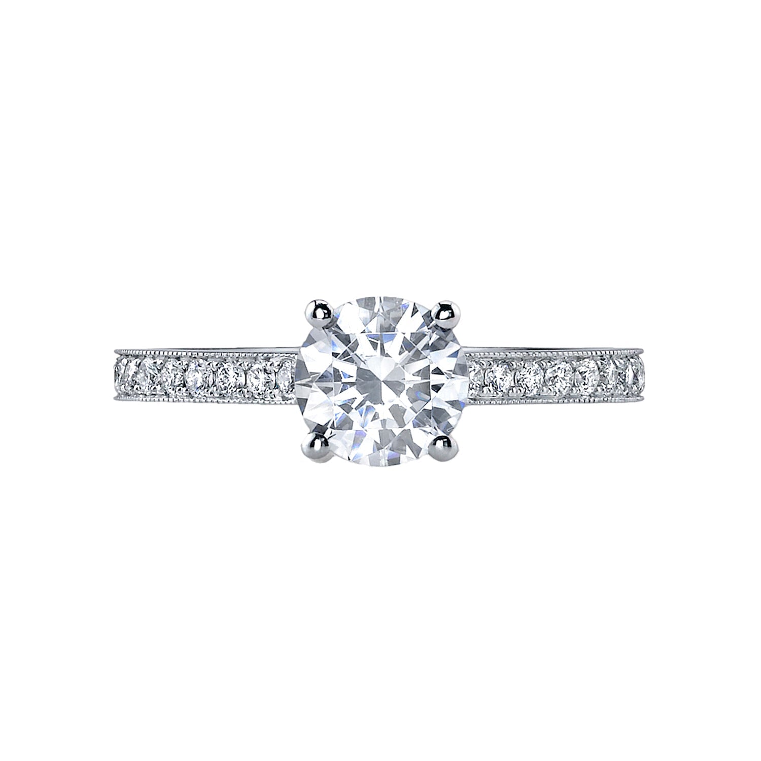 This classic engagement ring mounting is made of 18K white gold. The ring is designed to hold a round center stone in an 18K white gold setting. The shank of the ring is adorned with 0.26 carats of G-H color, SI clarity diamonds. Center diamond not included.