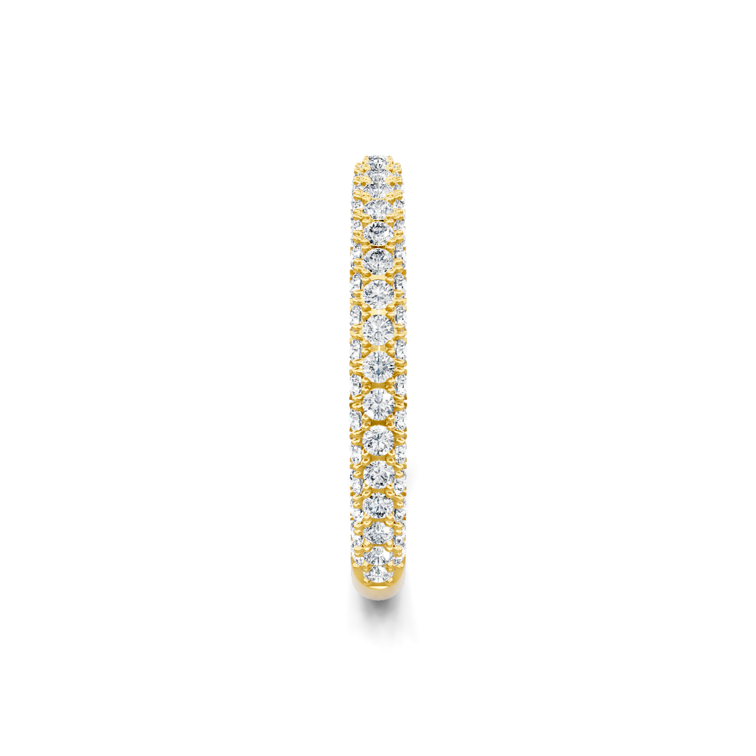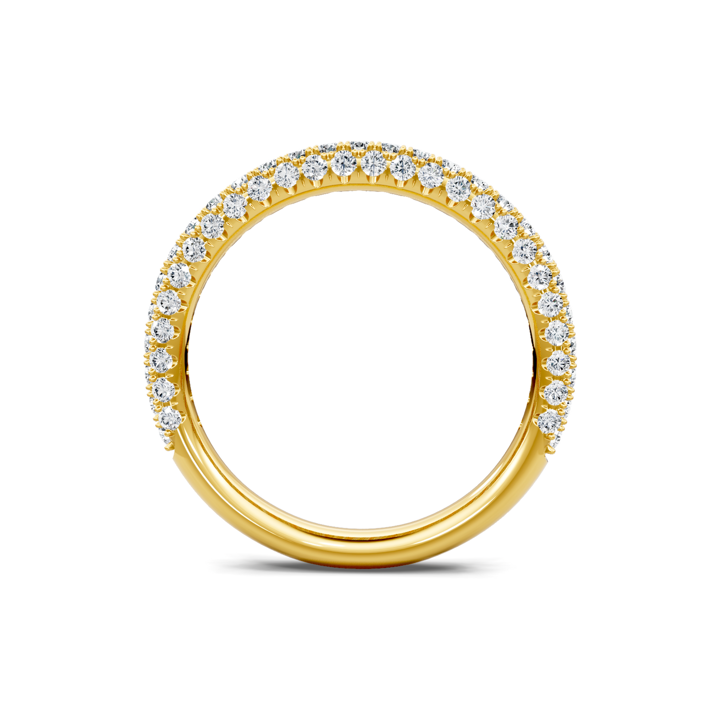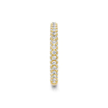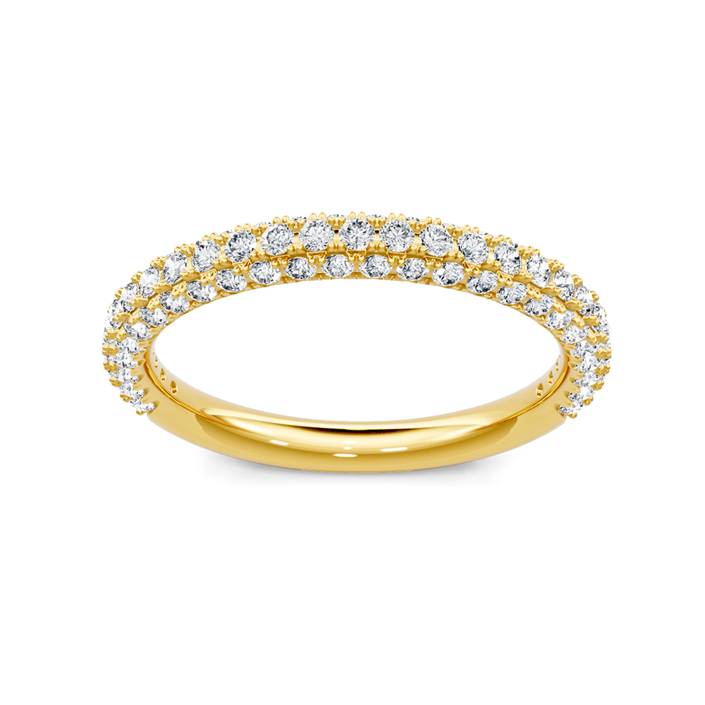 This diamond wedding band is crafted in 14K yellow gold. The ring showcases 0.62 carats of pave diamonds that are G-H in color and of SI clarity.