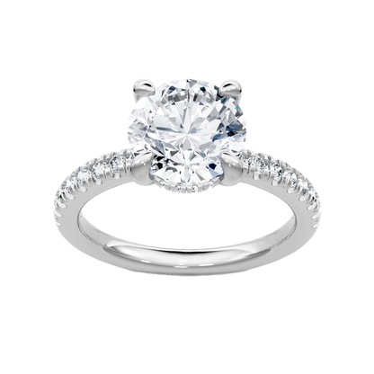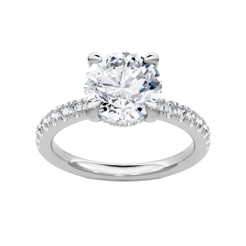 This engagement ring mounting is fashioned in 14K white gold. The ring is designed to hold a round center stone in a four prong setting with a hidden diamond halo. An opening in the shank underneath the setting creates the illusion of a floating diamond. The shank is adorned with pave diamonds. This mounting has a total diamond weight of 0.25 carats and does not include a center diamond.