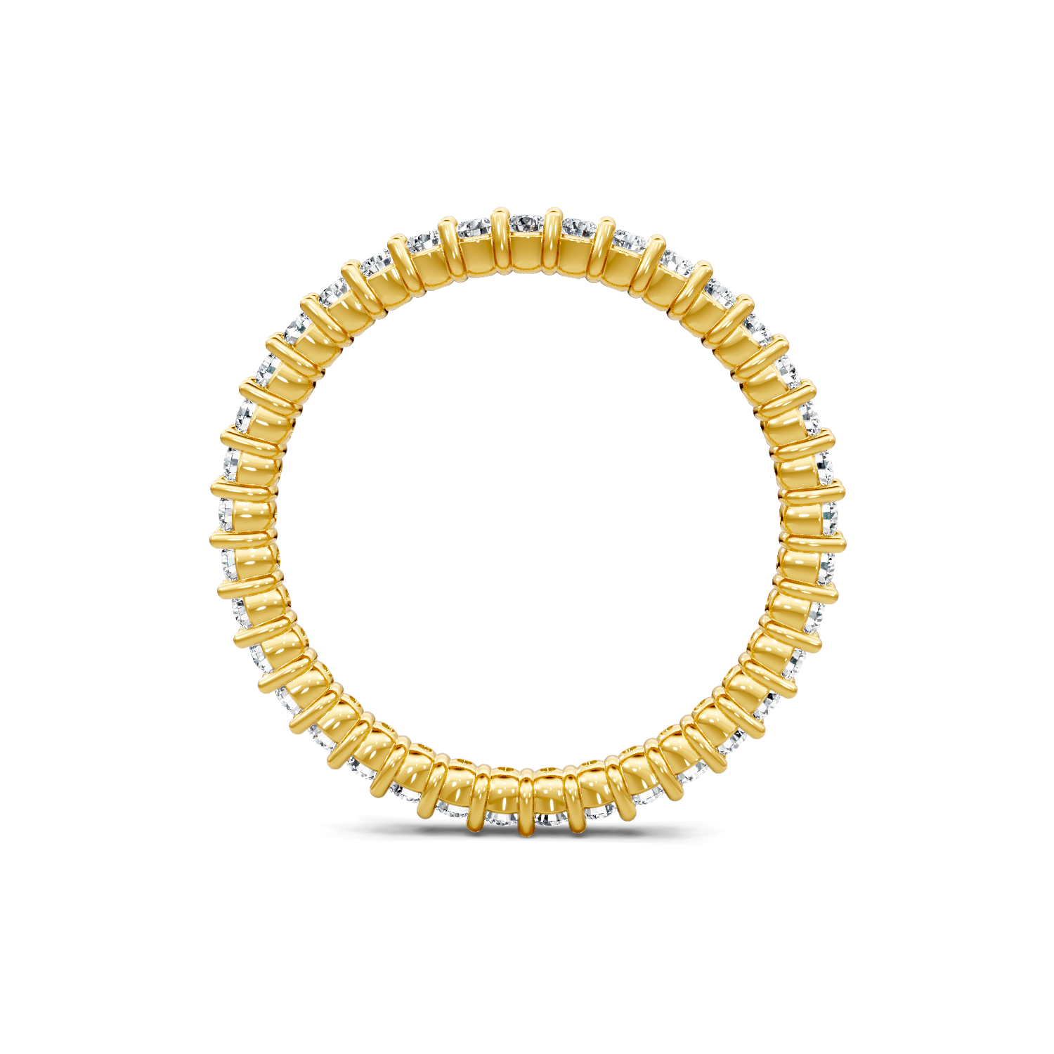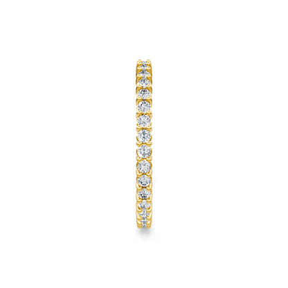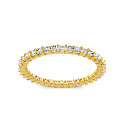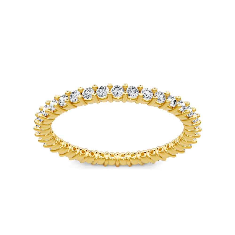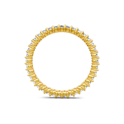 This round diamond eternity band is comprised of 14K yellow gold. The ring showcases 0.50 carats of G-H color, SI clarity diamonds in shared prong settings.