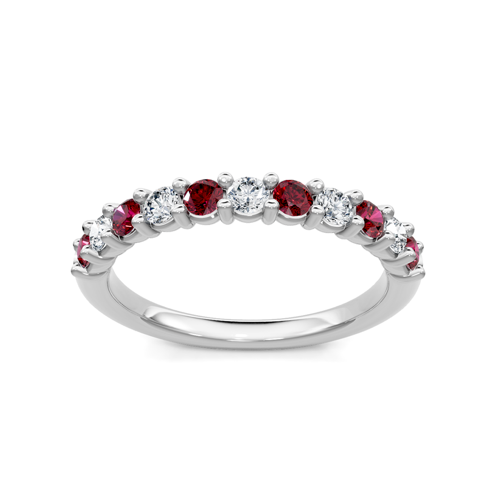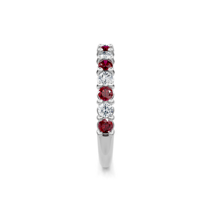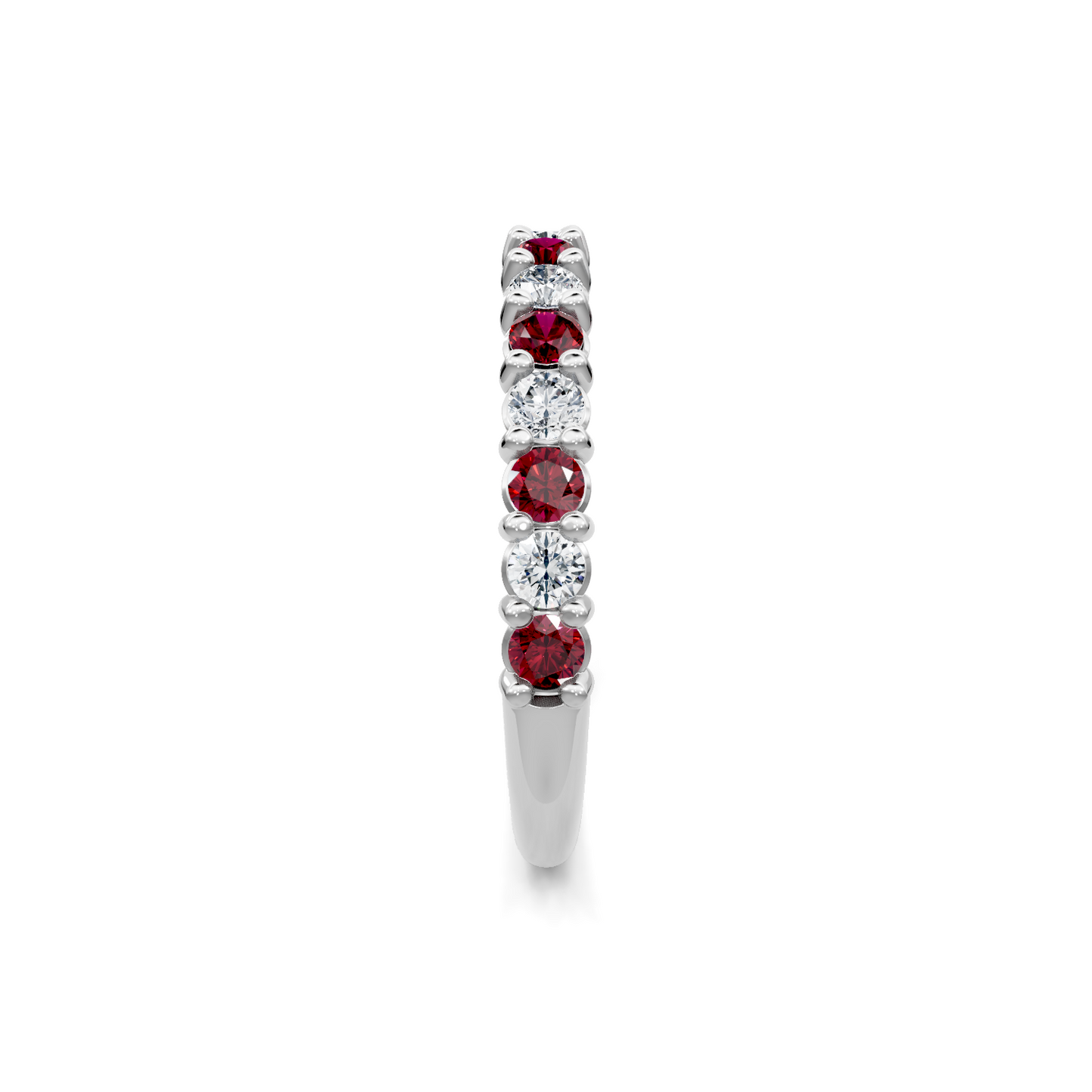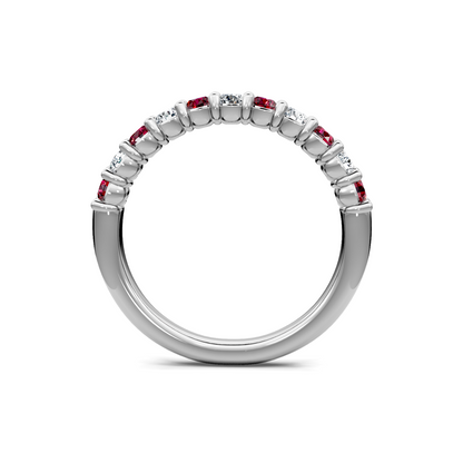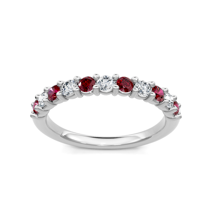 This ruby and diamond wedding band is fashioned in 14K white gold. The ring features 0.25 carats of round diamonds alternating between 0.30 carats of rubies. The diamonds are G-H in color and of SI clarity.