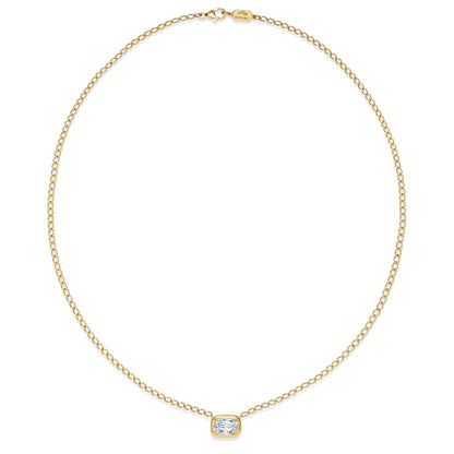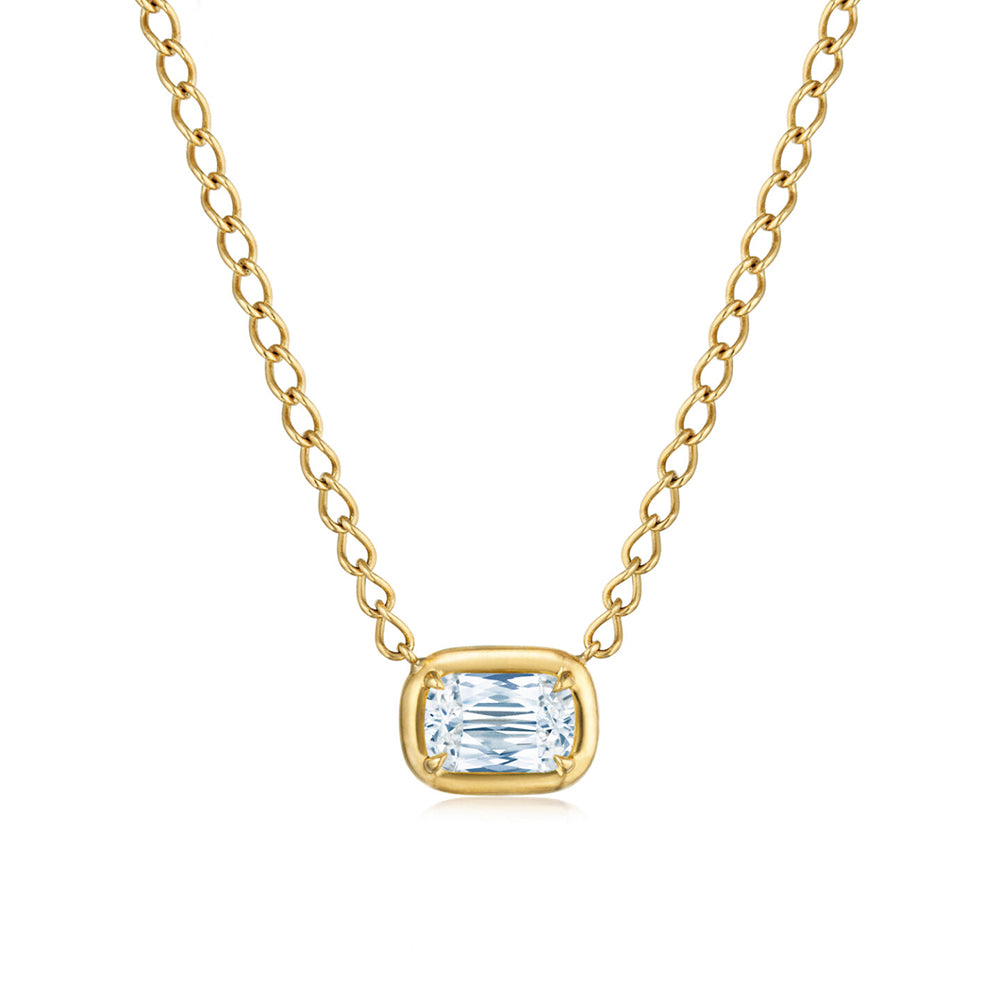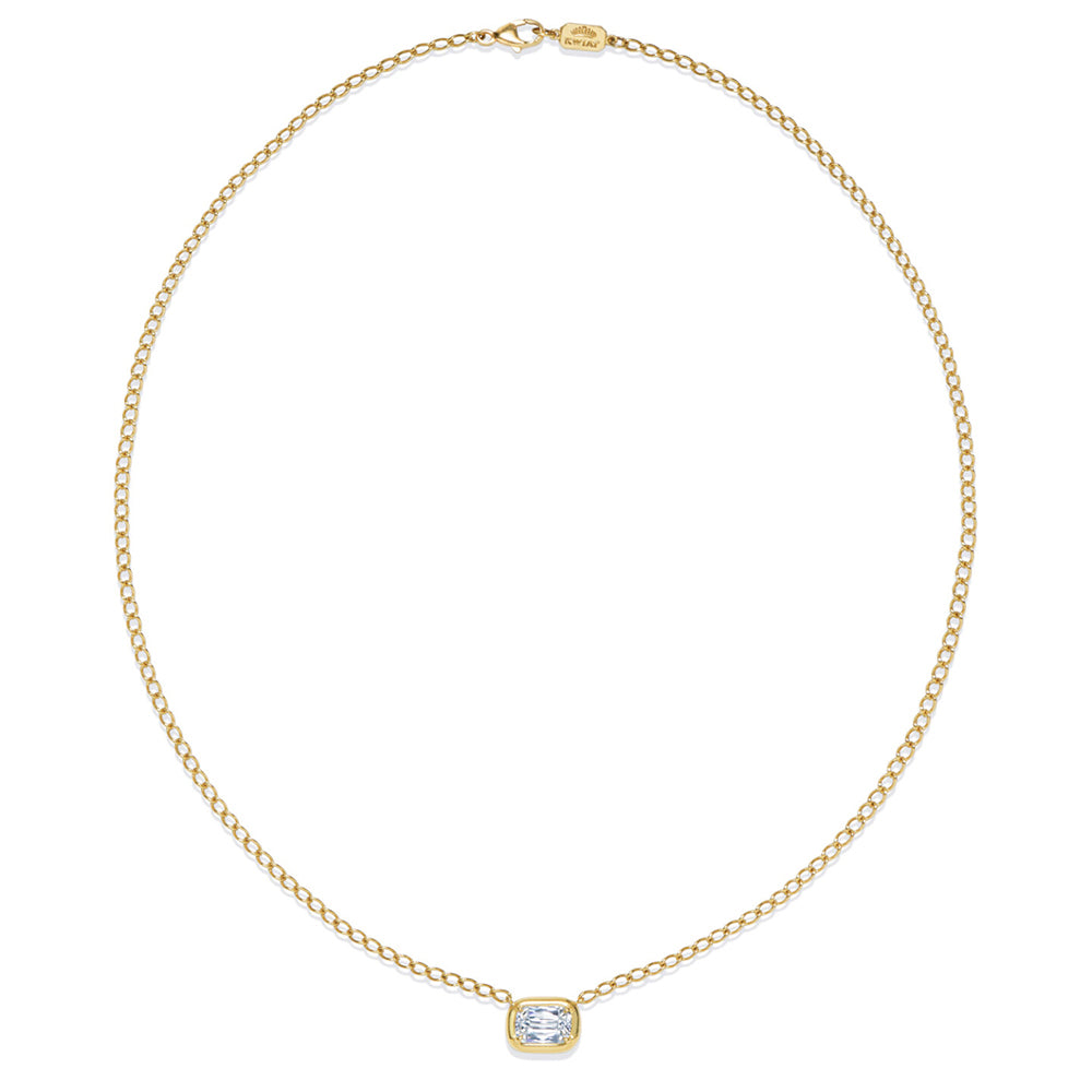 This Kwiat ASHOKA® diamond pendant is crafted in 18K yellow gold. The necklace is set with a 1.25 carat east-west set N color, SI2 clarity ASHOKA® diamond center stone. The necklace chain measures approximately 16 inches.