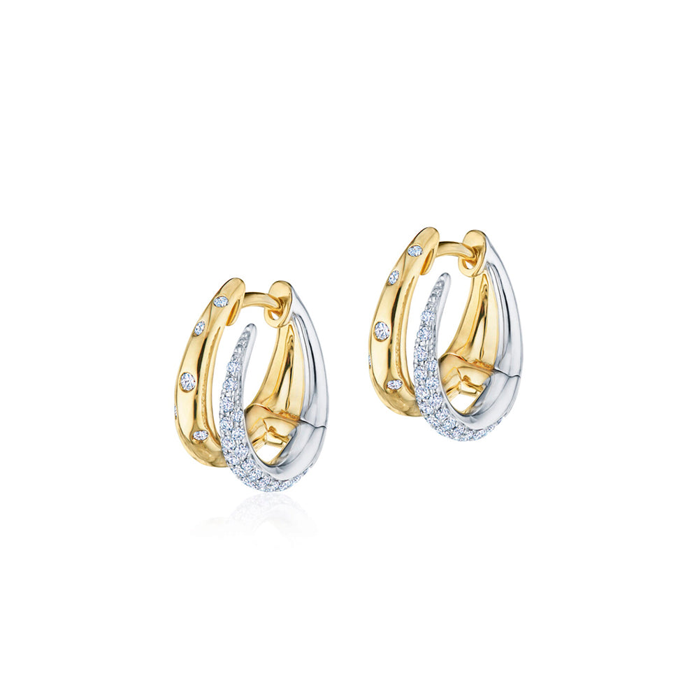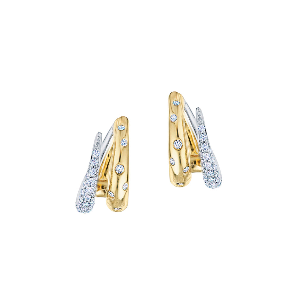 These Kwiat Orbit hoop earrings are crafted in 18K yellow and white gold. The hoops are set with 0.35 carats of G-H color, VS clarity round diamonds.