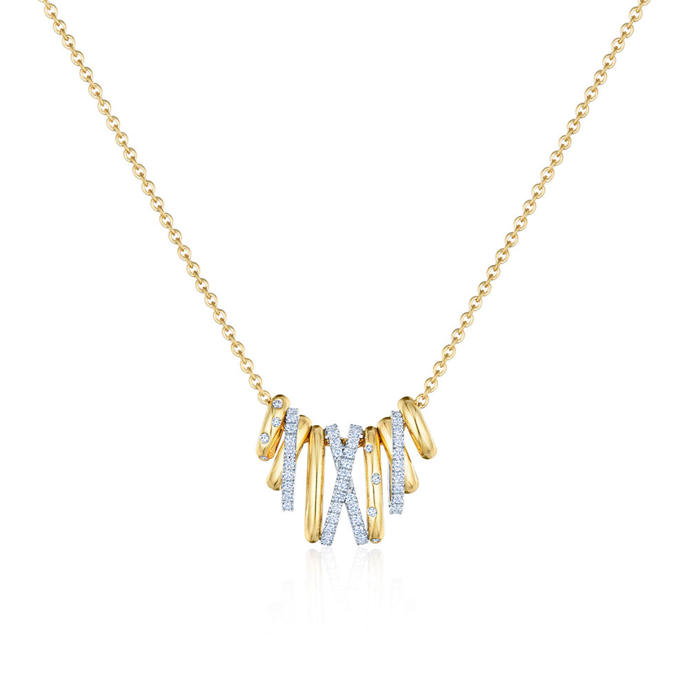 This Kwiat Orbit necklace is made of 18K yellow and white gold and is set with G-H color, VS clarity round diamonds. The pendant has a total diamond weight of 0.63 carats.