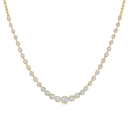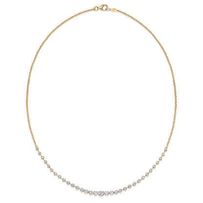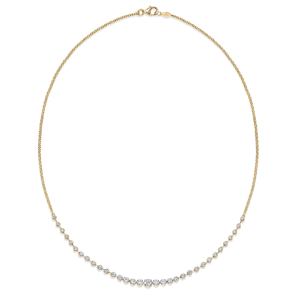This Kwiat Starry Night Demi-Riviere necklace is fashioned in 18K yellow gold. The necklace is 1.45 carats of G-H color, VS clarity diamonds of graduating sizes. The necklace measures approximately 16 inches long and is secured by a lobster clasp.