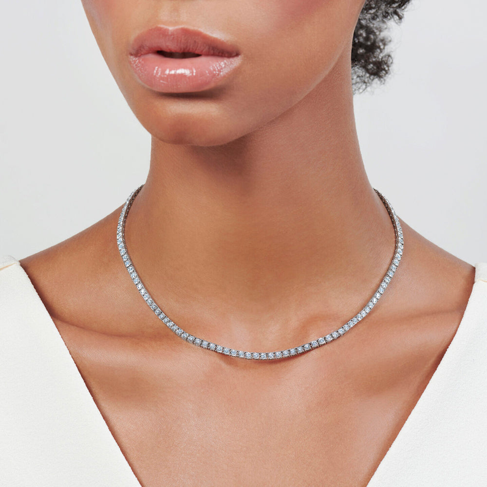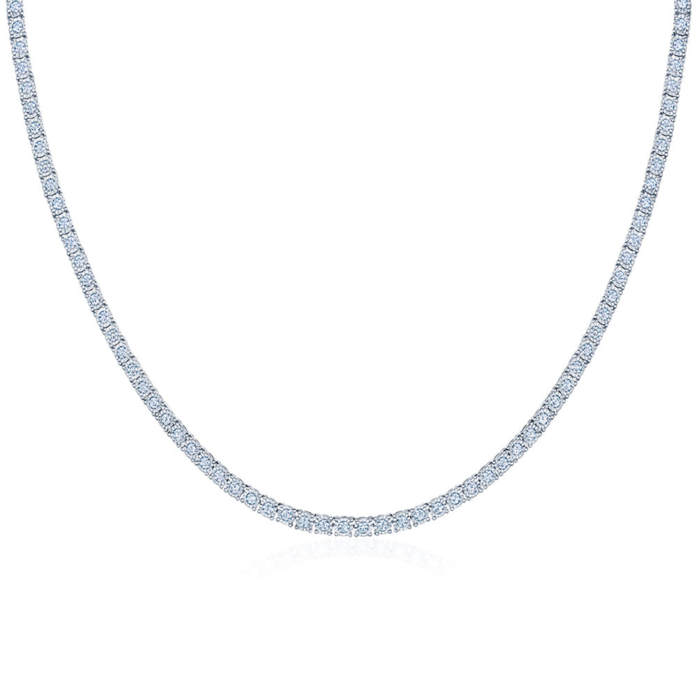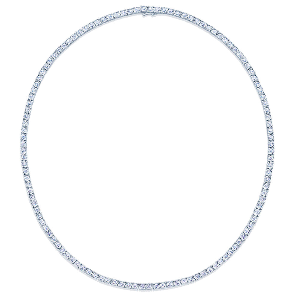 This Kwiat Sunburst diamond line necklace is crafted in 18K white gold. The necklace is set with 3.89 carats of G-H color, VS clarity diamonds. This diamond line necklace measures approximately 16 inches long.
