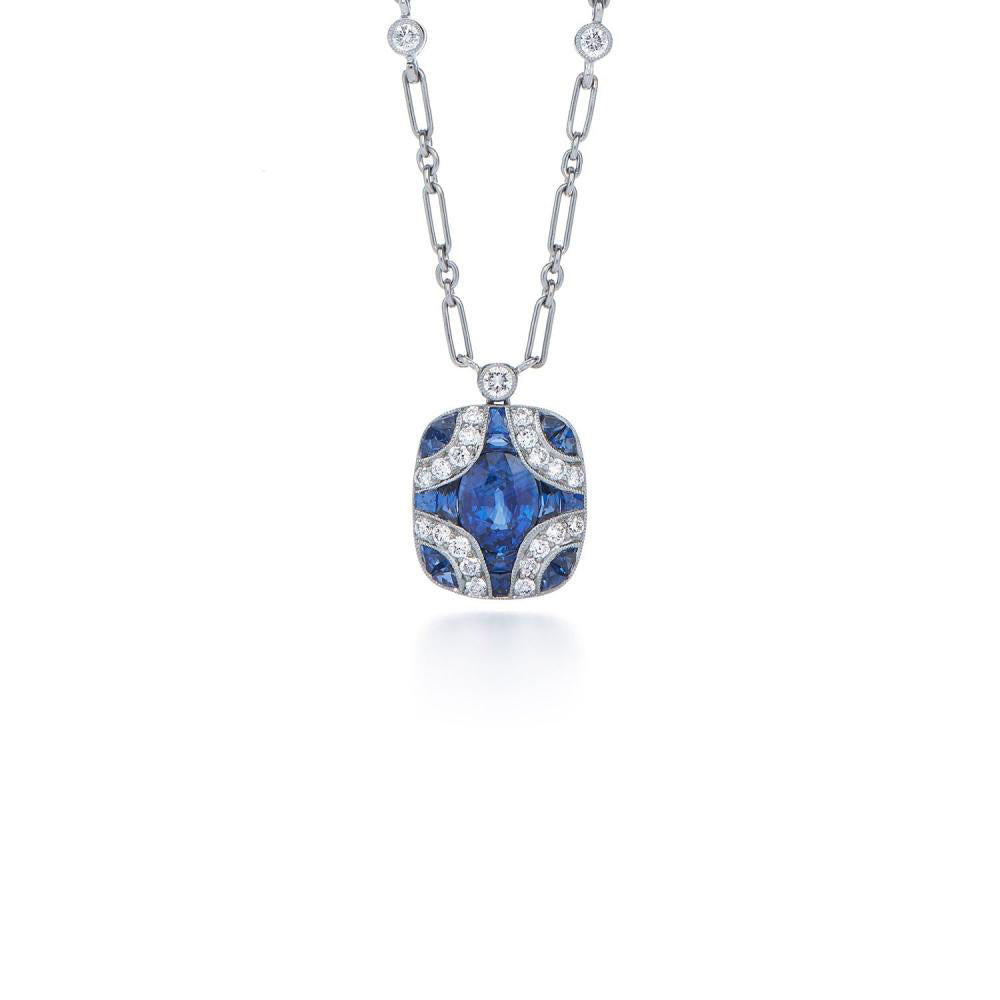 This Kwiat Vintage Argyle Pendant is made of 18K white gold. It is set with 0.25 carats of G-H color, VS clarity diamonds and 1.34 carats of blue sapphires.