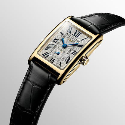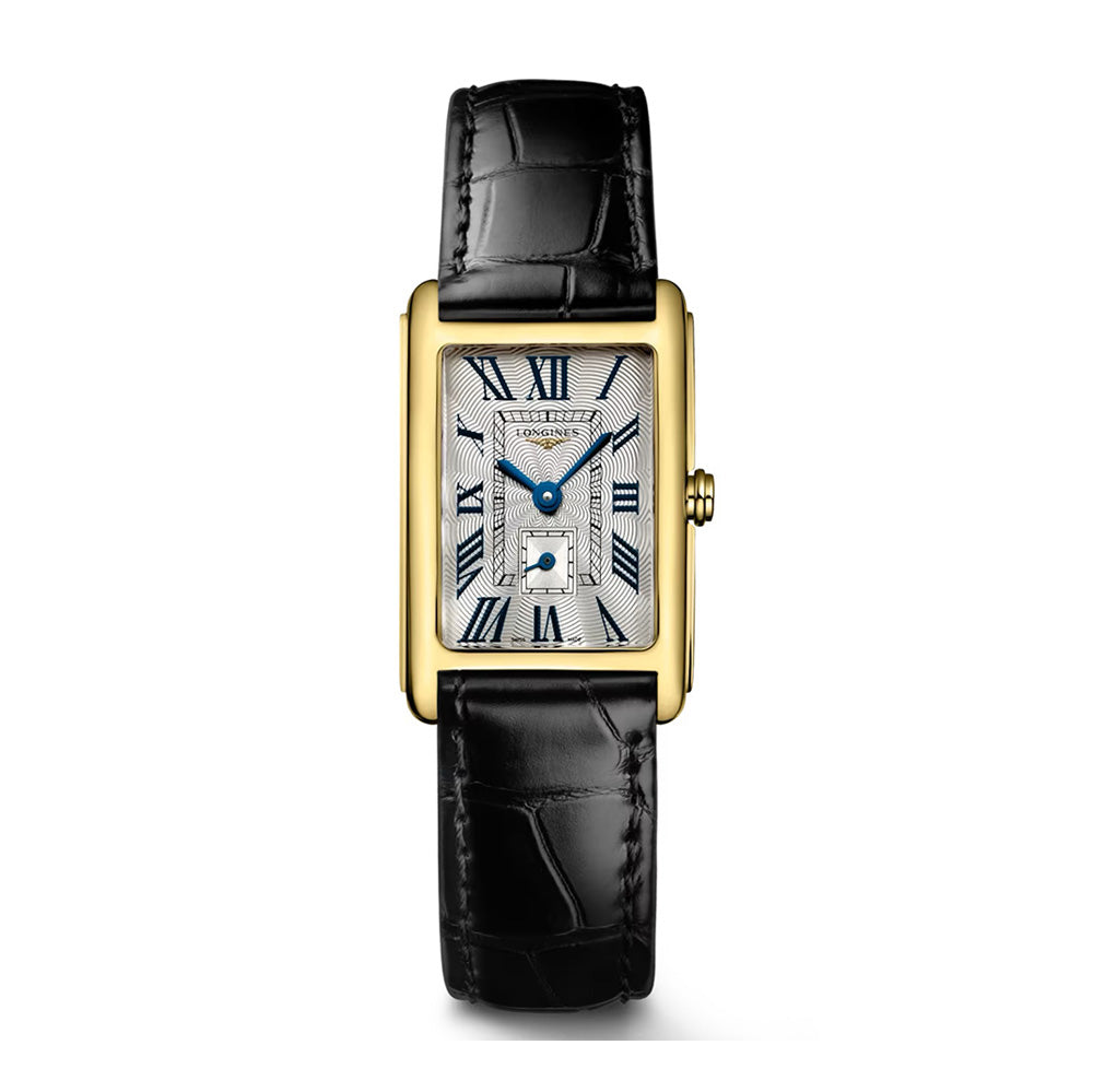 The Longines Dolcevita watch is powered by a quartz movement inside of a 20.50 x 32.00mm yellow gold case. The silver flinqué dial is protected by sapphire crystal. The black leather strap leads to a deployment clasp. Water resistant to 30 meters.