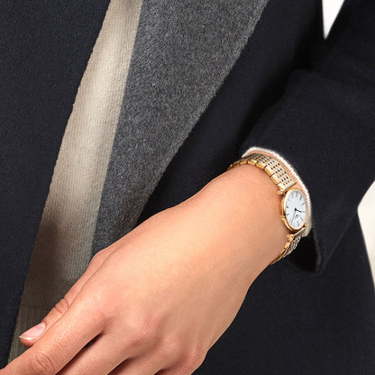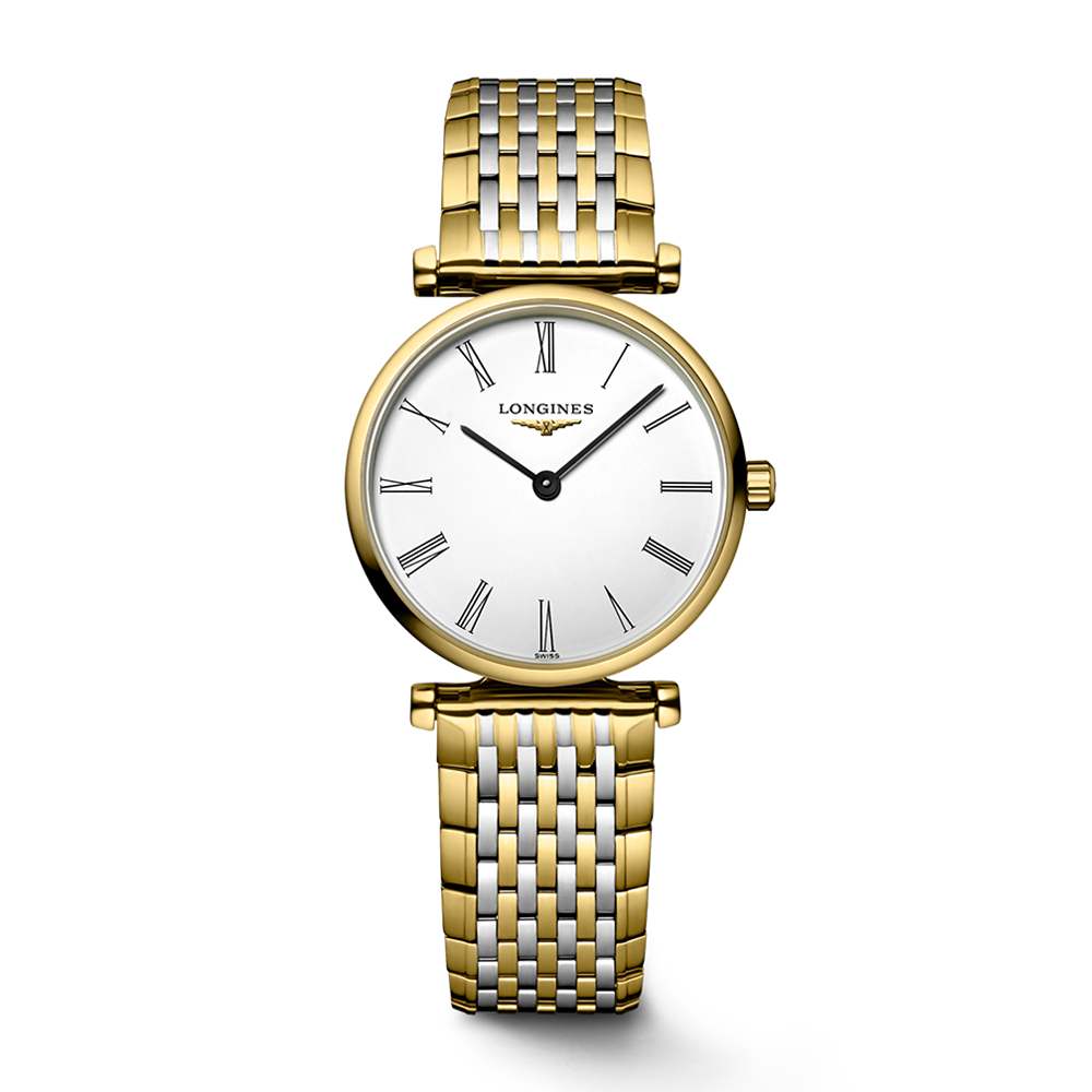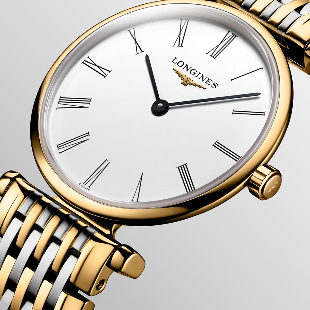 The Longines La Grande Classique de Longines watch is powered by a quartz movement inside of a 24mm stainless steel and yellow gold PVD case. The white dial has Roman numerals and is protected by sapphire crystal. The stainless steel and yellow gold PVD bracelet leads to a folding clasp. Water resistant to 30 meters.