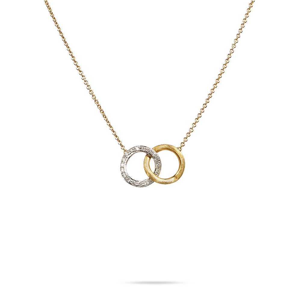 This Marco Bicego Jaipur pendant necklace is crafted in 18K yellow and white gold. The pendant is comprised of interlocking yellow gold and white gold open circles. The white gold circle is set with 0.14 carats of diamonds. The pendant hangs from a 16.5 inch chain necklace.