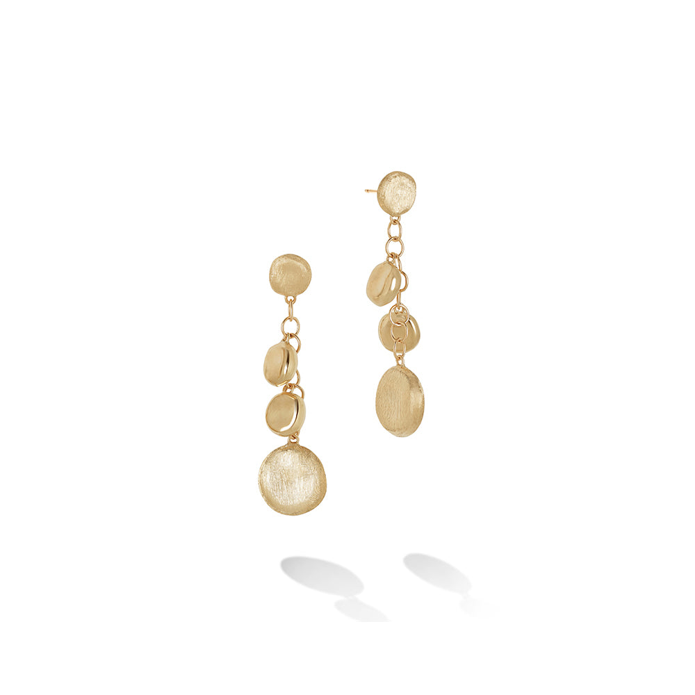 These Marco Bicego Jaipur drop earrings are crafted in engraved and polished 18K yellow gold. The dangle earrings feature circular gold charms secured to a chain. They measure approximately 1.65 inches long.